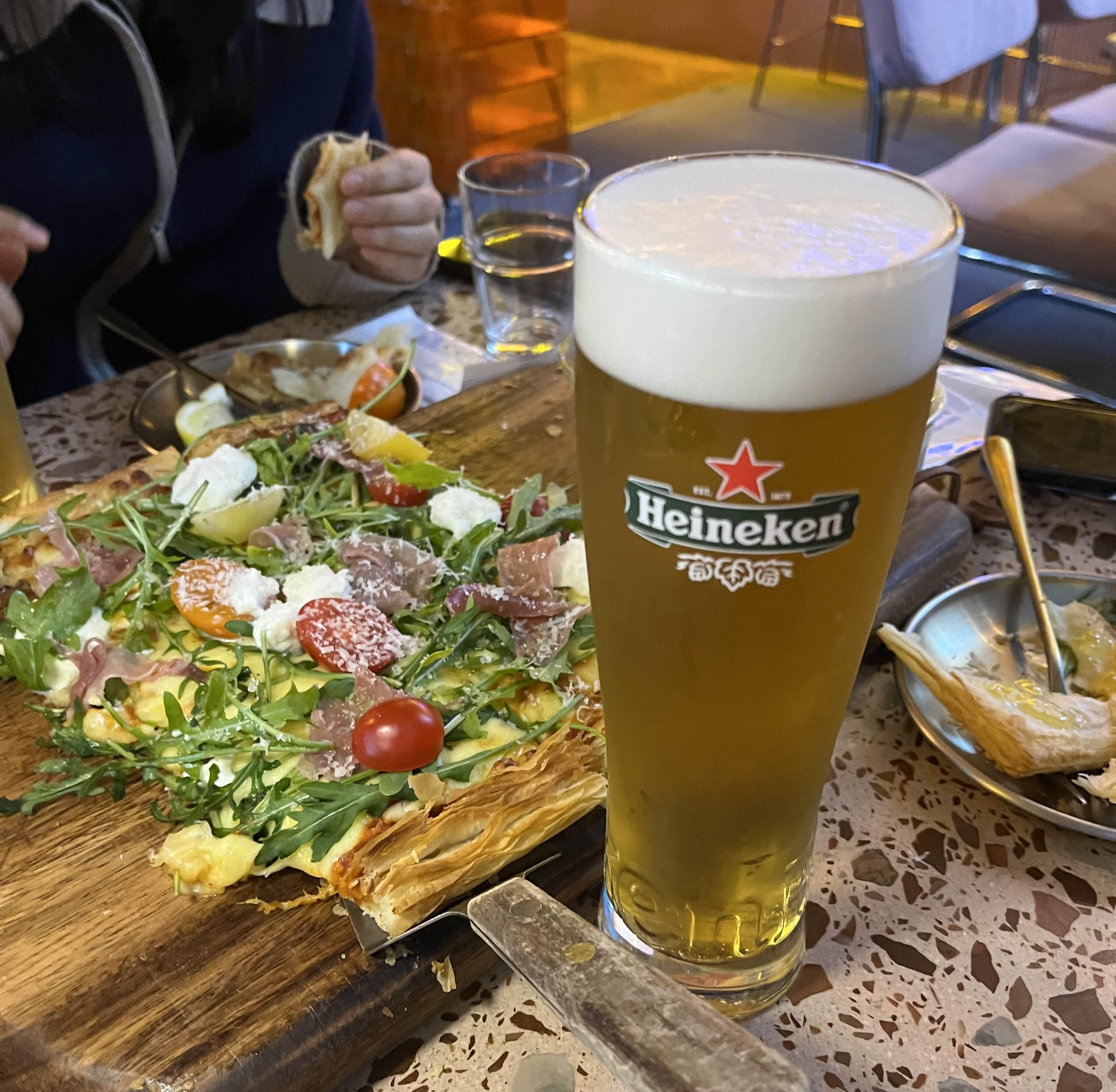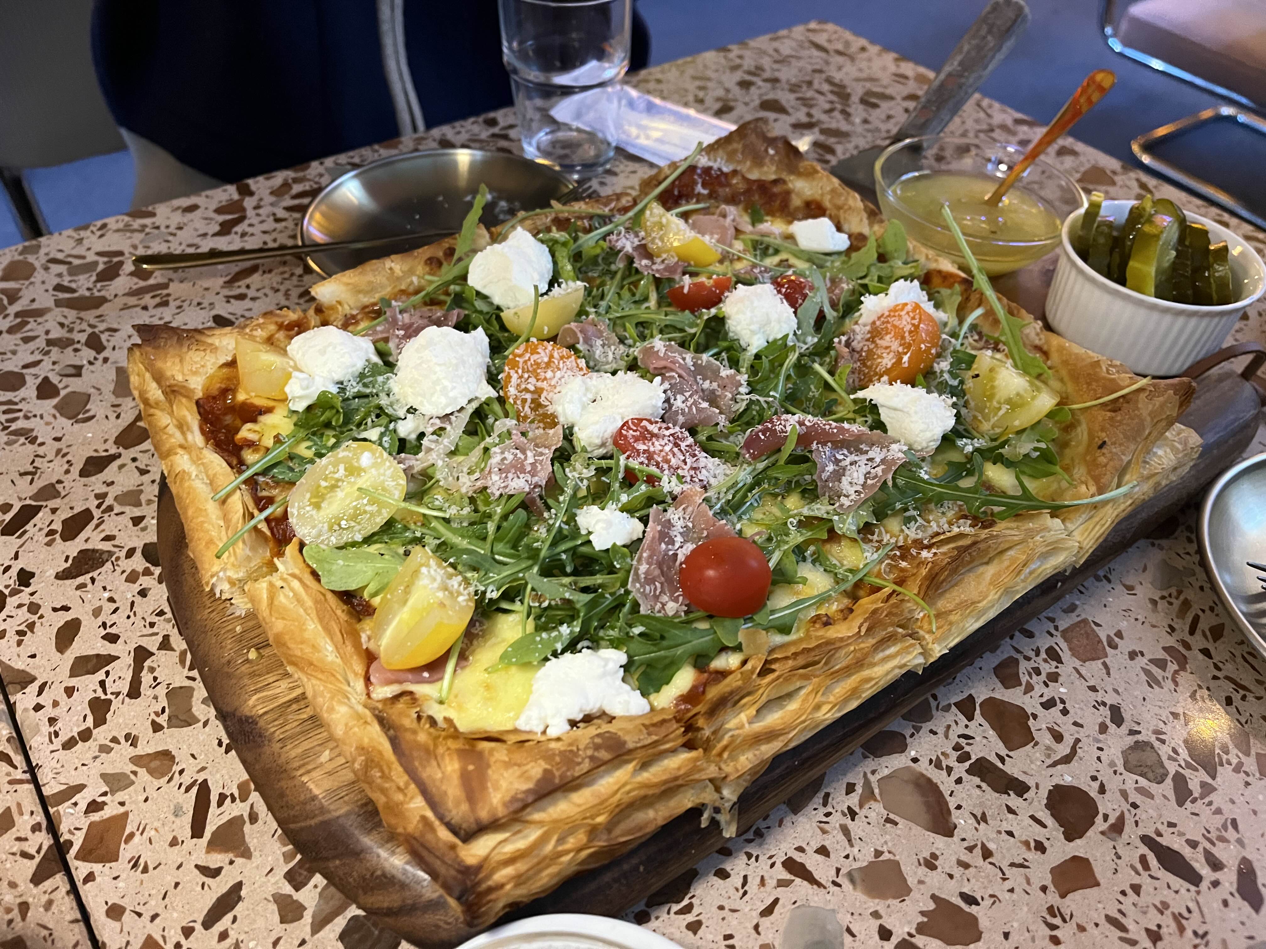 우리가 주문한 피자가 먼저 나왔다. 나무 도마에 얹어진 피자에는 치즈와 토마토가 듬뿍 올려져있었다. 빵이 여러겹으로 되어있어 고소하고 바삭했다.