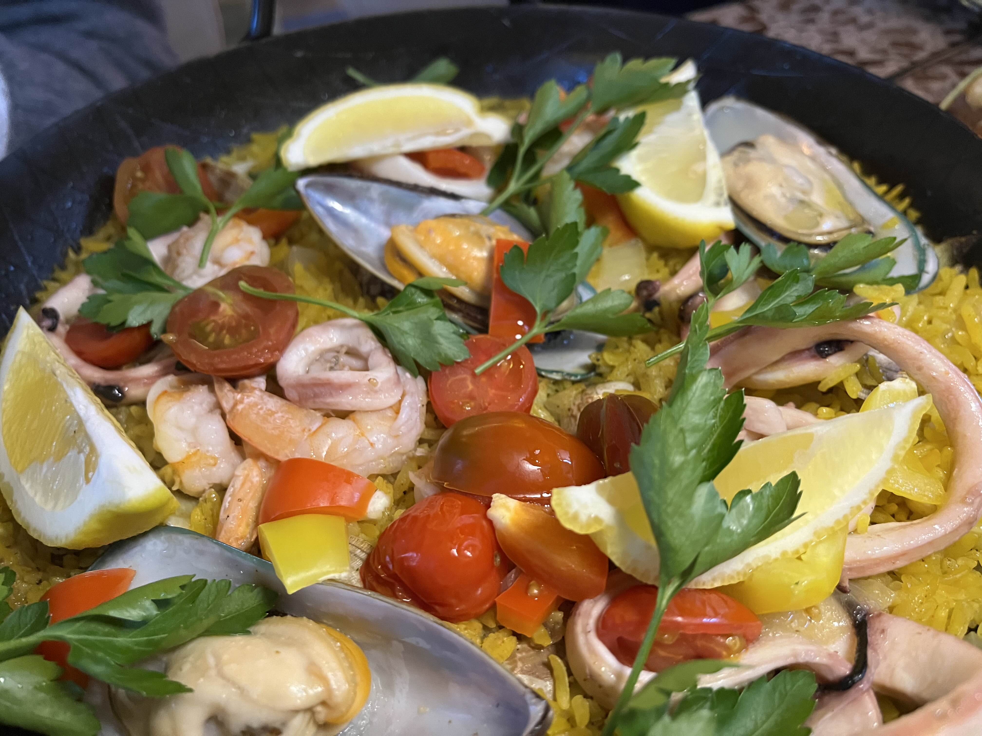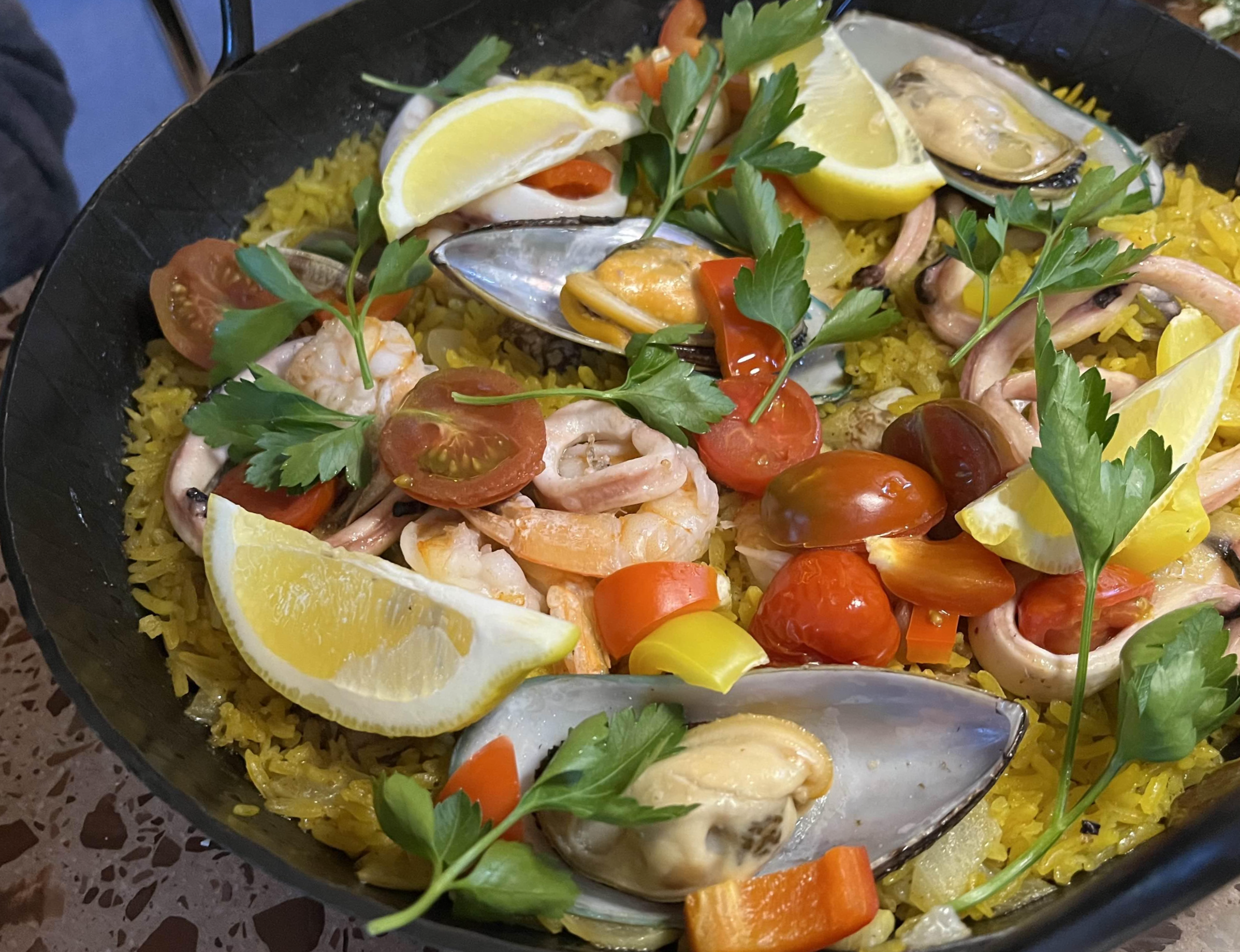 다음으로 주문한 빠에야가 나왔다. 빠에야에는 홍합과 새우 오징어 토마토가 들어가있었다. 황금색 밥알에 기대가 잔뜩 되었다.