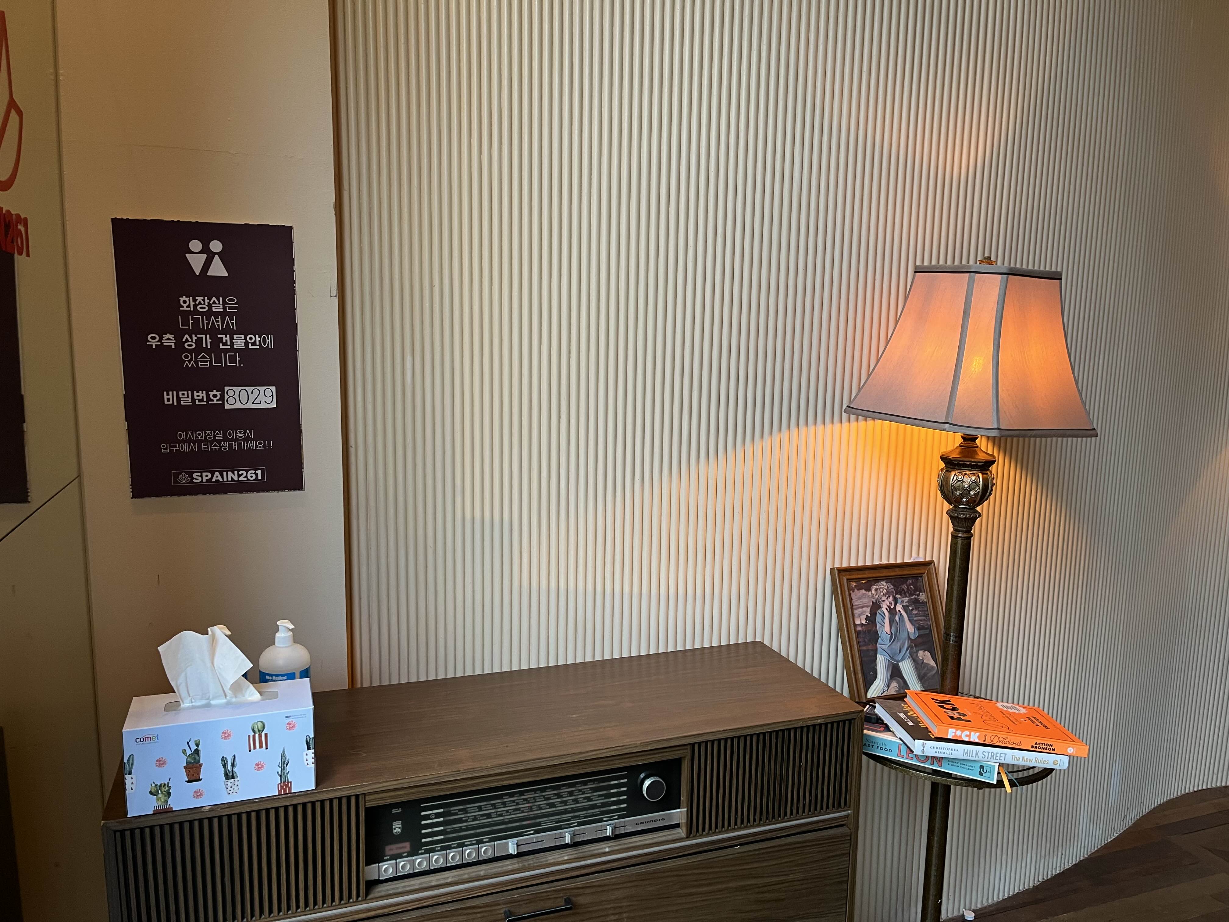 화장실은 외부에 있어 바깥으로 나가서 상가 건물 안으로 가야한다. 휴지와 손소독제가 마련되어있어 가지고 나가면 된다.