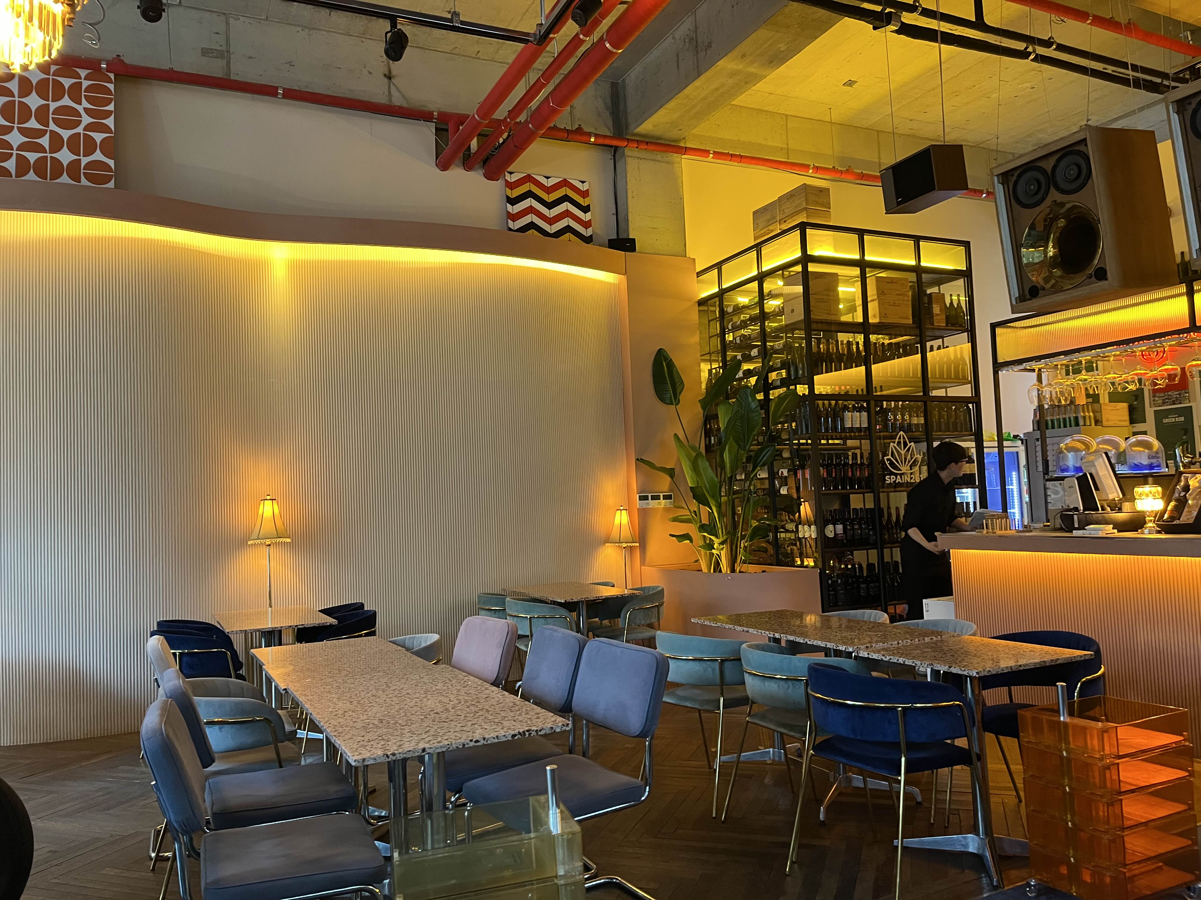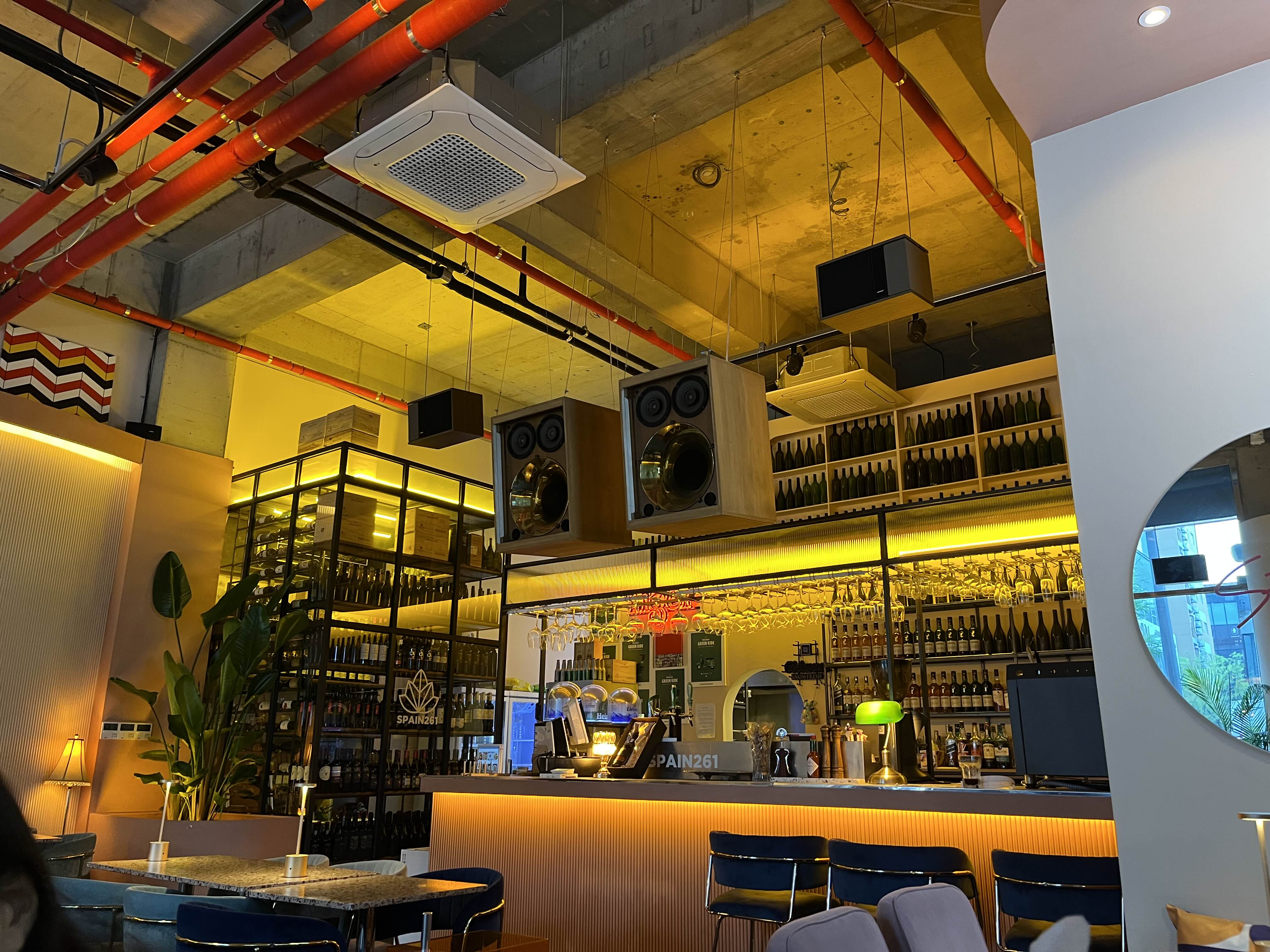 스페인261 라운지는 노란 조명과 함께 중앙의 커다란 스피커가 눈에 띈다. 무척 무거워 보여서 떨어지지 않을까 노심초사해서 눈길을 끄는 매력이 있다 ㅋㅋ