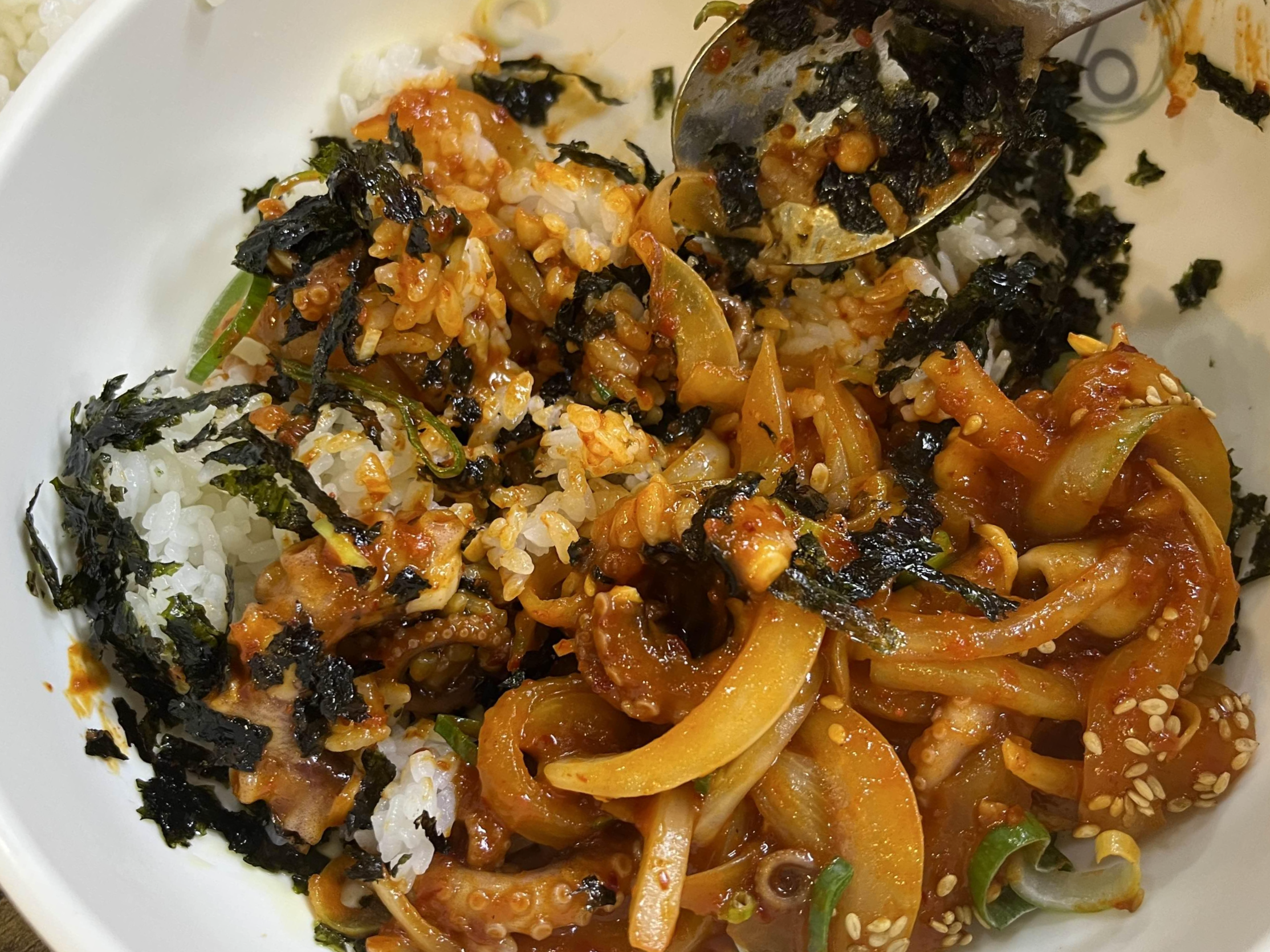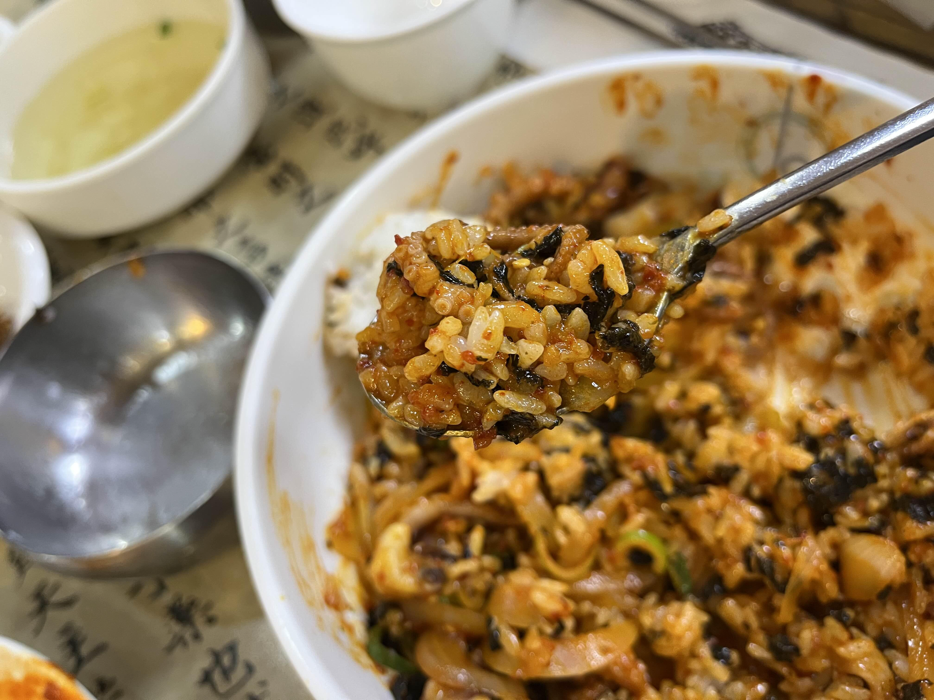 밥과 낙지볶음을 넣어 비비기 시작했다. 편집을 하는 지금도 침이 고이는 비주얼이다.
