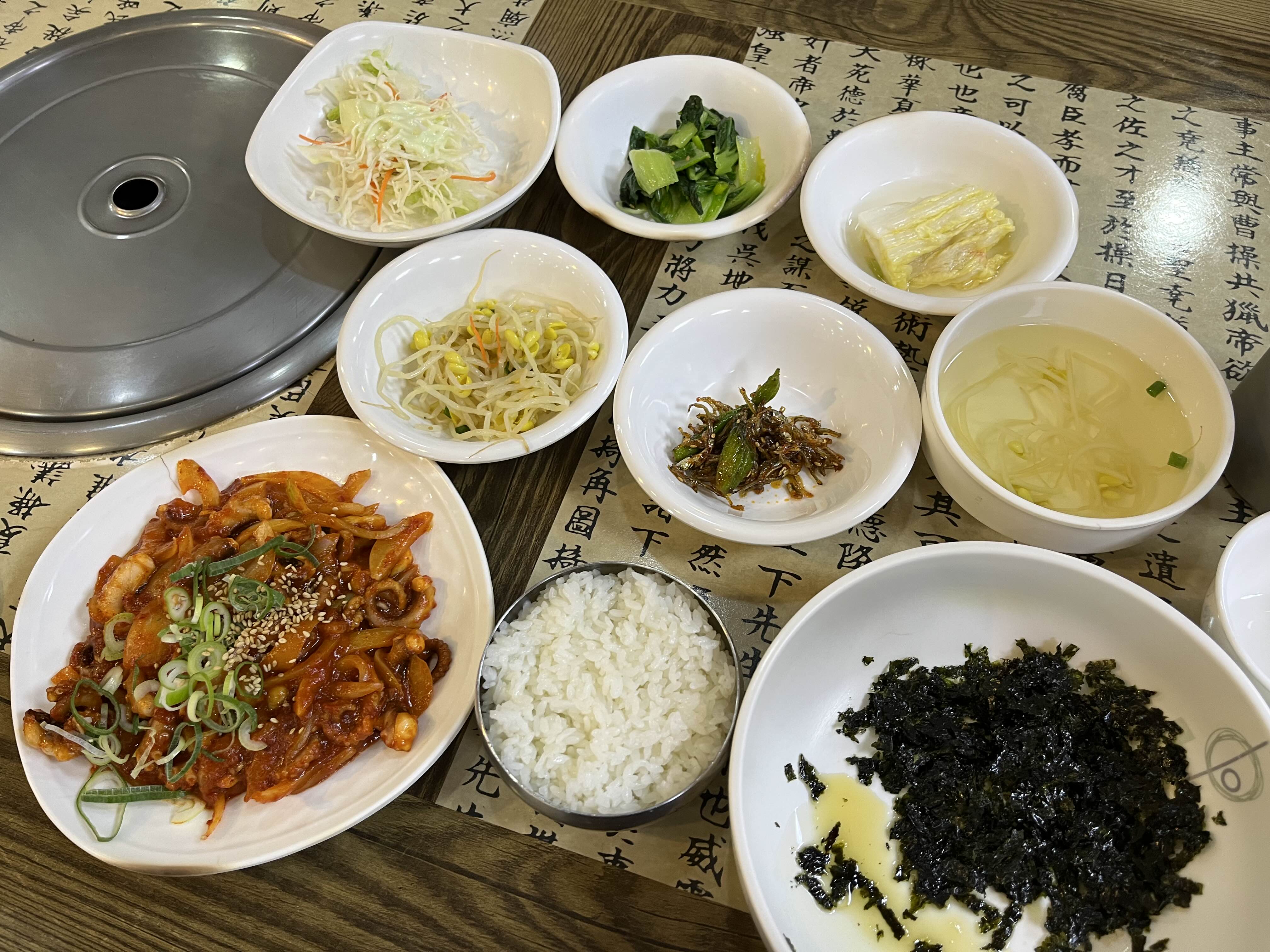 오늘은 혼자 방문했으므로 점심시간에 혼자 먹기 좋은 낙지비빔밥을 주문했다. 2인 이상이면 낙지백반을 주문할 수도 있다. 혼자 앉았는데도 5가지 반찬에 메인 낙지볶음, 콩나물국까지 제공된다.
