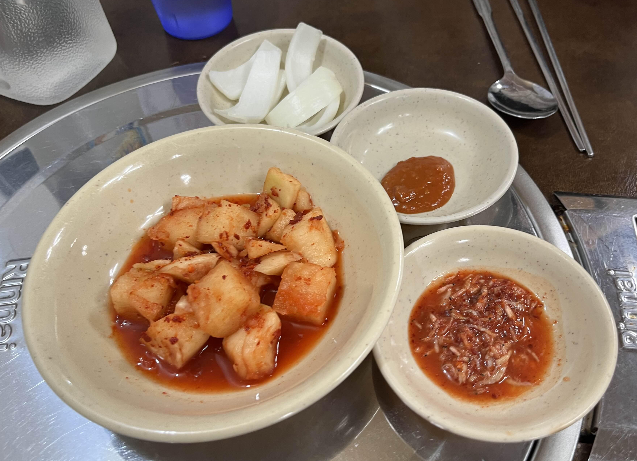 입맛을 개운하게 해주기 위해 같이 주신 깍두기, 양파와 같이 먹었더니 국밥을 더욱 시원하게 즐길 수 있었다.