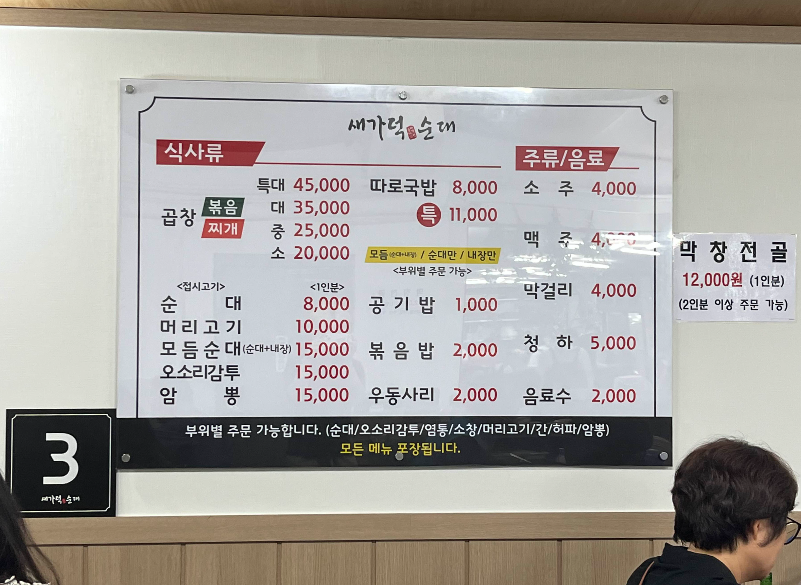 육거리 시장 맛집 새가덕순대에는 순대국밥과 곱창볶음, 모듬순대, 막창전골 등의 메뉴가 있었다. 가격이 적당해서 마음에 들었다.