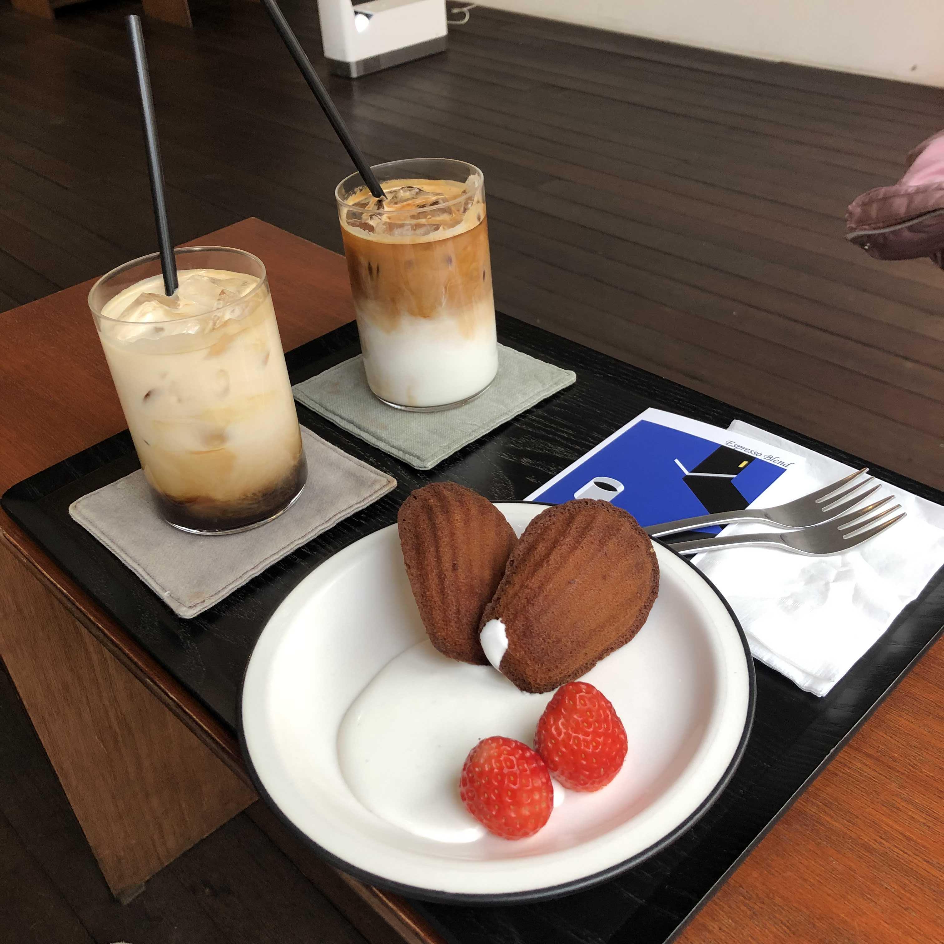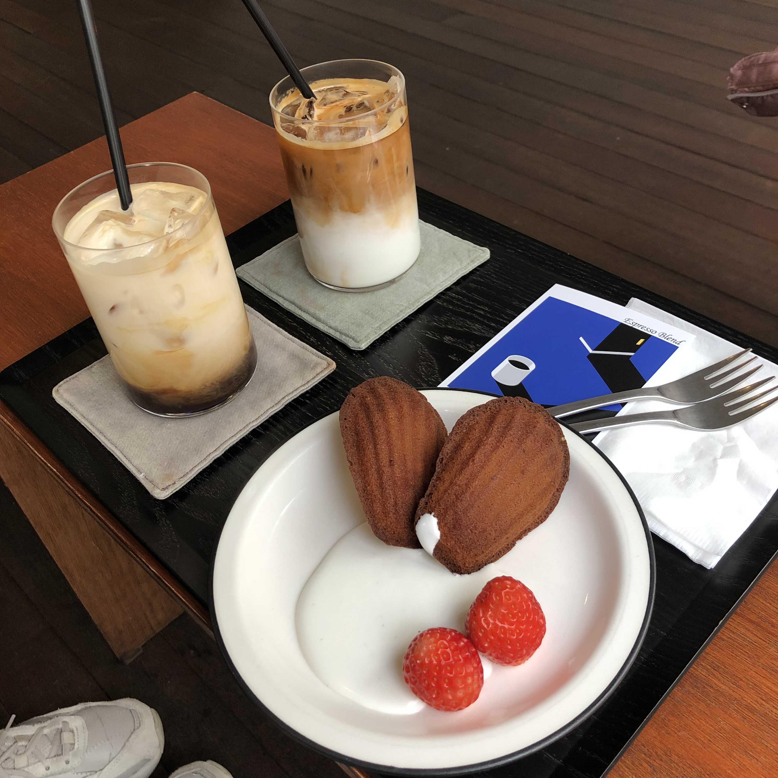이곳은 듁스커피 원두를 사용한다. 친구가 이 카페를 추천한 이유가 이거였다. 친구는 듁스커피가 좋아서 듁스 원두를 이용하는 카페를 찾아다닌다고 두어달 전에 말했던 것 같다. 개인적으로 난 듁스커피를 별로 좋아하지 않는다. 듁스 커피를 파는 곳마다 산미가 강했는데 그게 원래 듁스의 특징인 것인지 모르겠지만..라떼를 시켰는데도 신 맛이 느껴졌다. 바닐라 마들렌은 맛있었고 작은 딸기도 상큼했다.