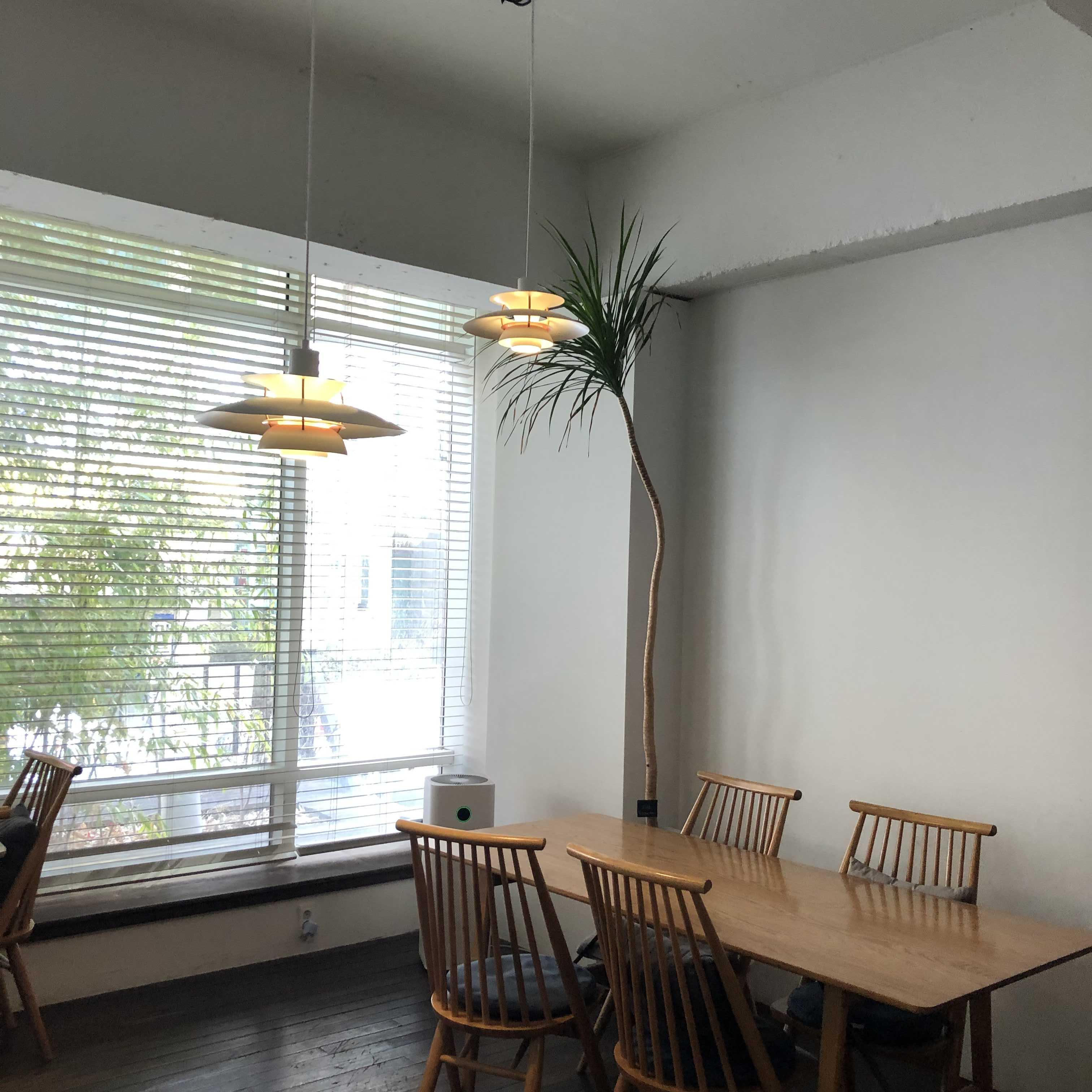 책상이 넓고 의자가 편해서 작업하거나 오래 머물기 좋을 것 같다. 조명은 한때 인테리어 잡지 좀 봤다 하는 사람이라면 모두들 봤을 그 조명. 밖에서 봤을 때 실내가 어두워 보였는데 이 조명 두 개 덕에 찾아 들어왔다.