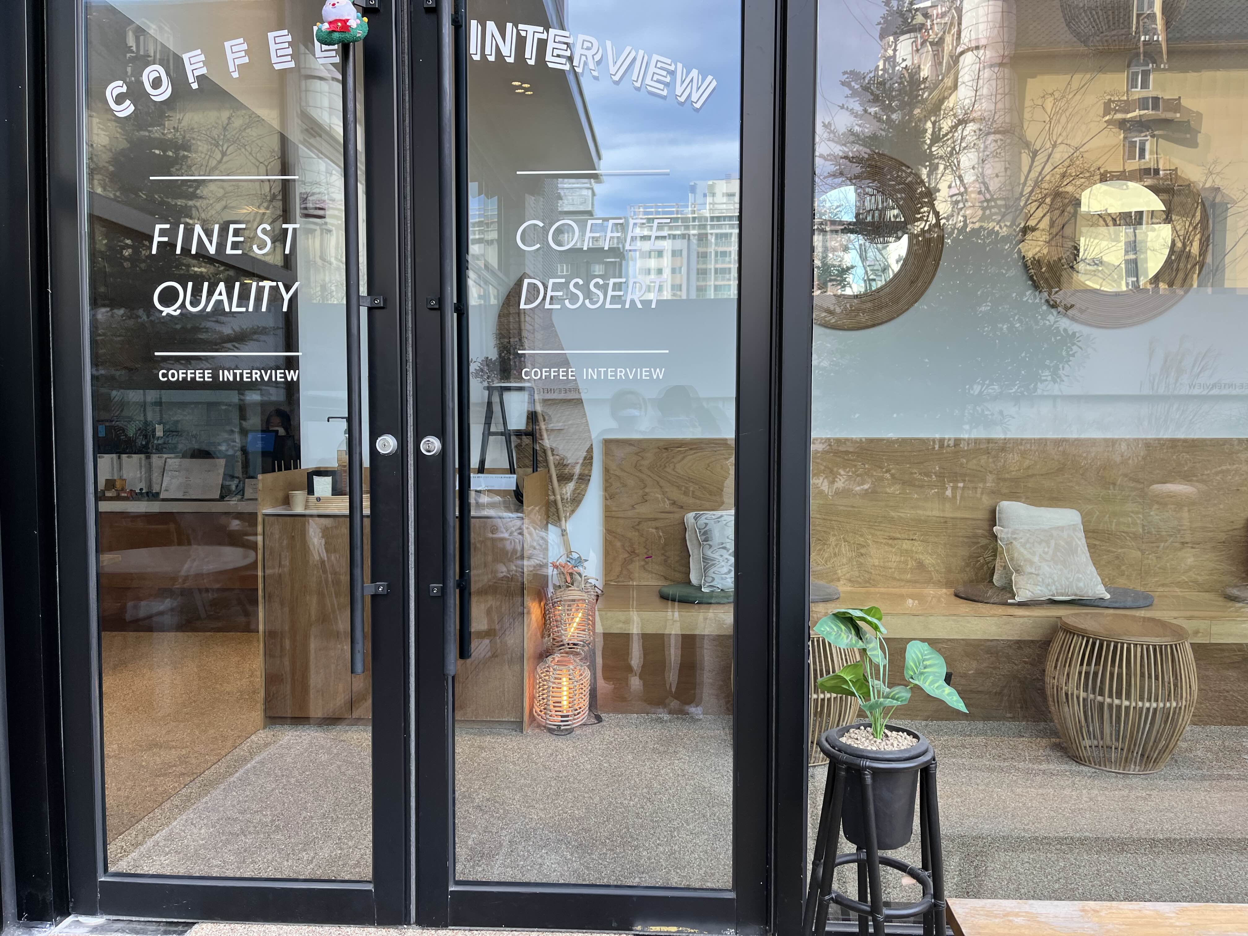 입구는 숨겨져 있는 것처럼 보인다. 건물과 벽이 가운데 마당을 감싸고 있어 안락하고 비밀스러운 느낌을 준다. 하얀 벽은 이렇게 사진을 찍으라고 일부러 배치해둔..것이 틀림 없다고 본다. 키보다 위에 오는 커피인터뷰라는 글씨