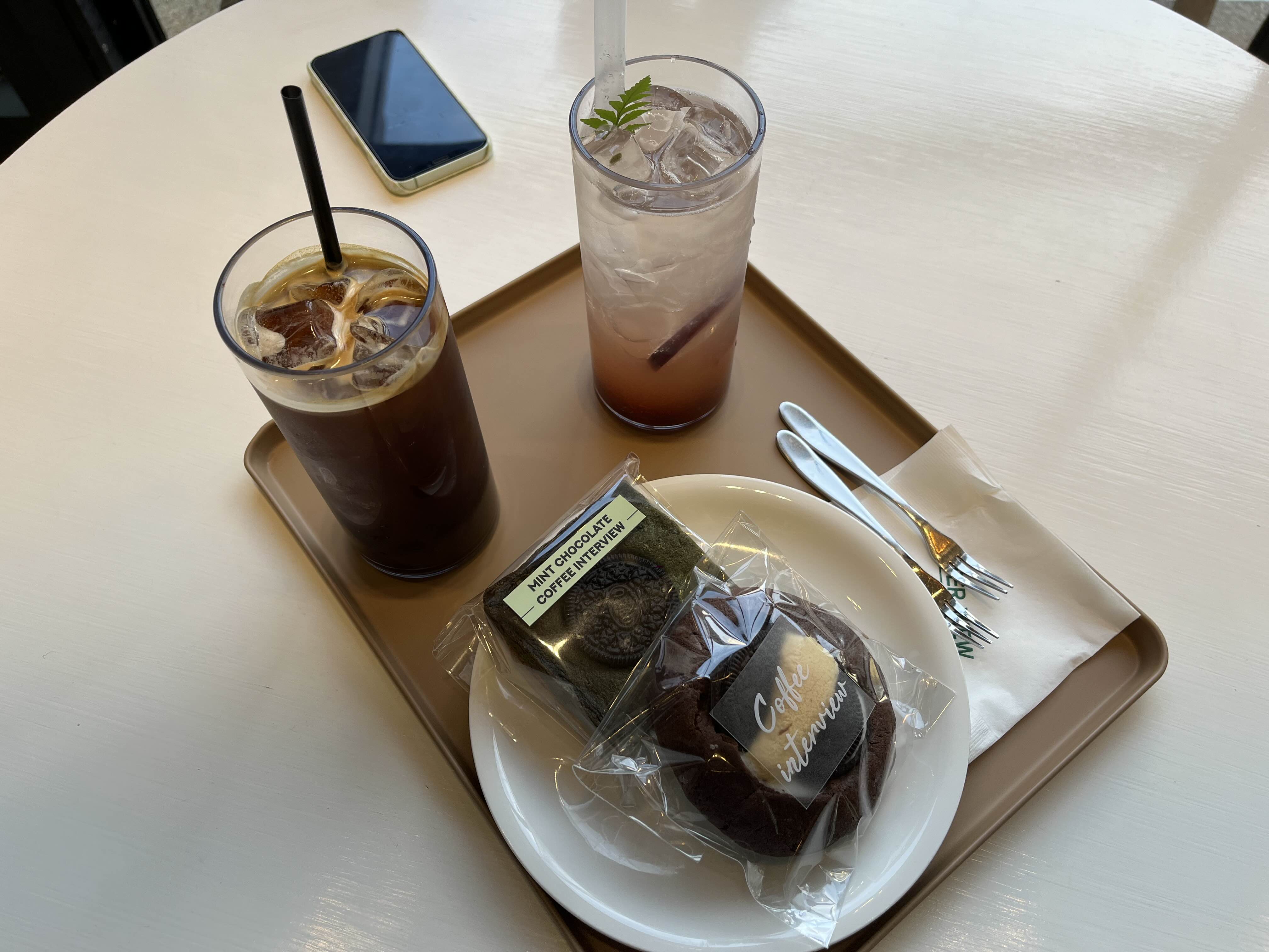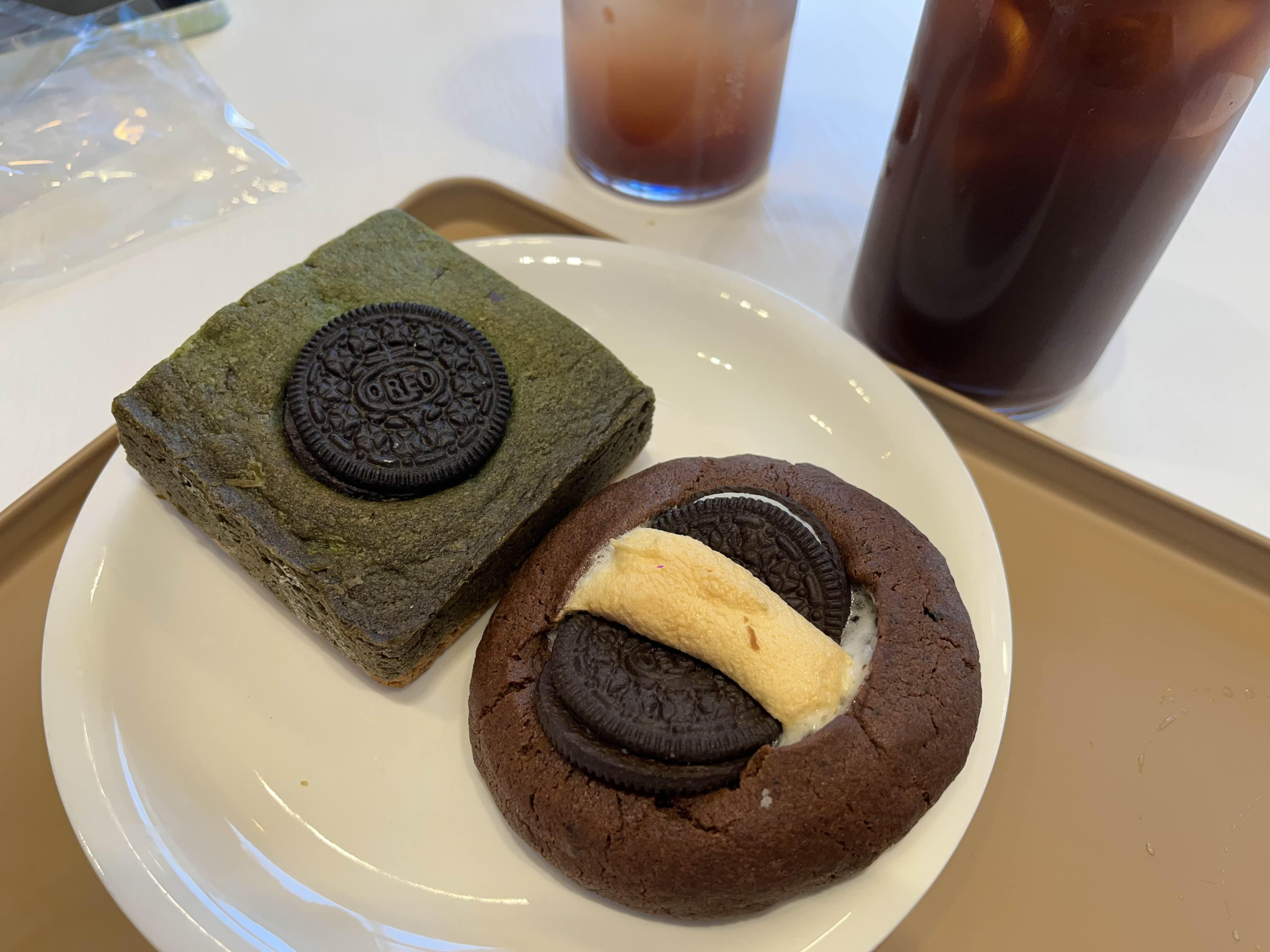 음료가 나왔습니다. 부시맨 아메리카노와 자두에이드. 민트초코버터바와 초코오레오쿠키다. 민트초코버터바는 별로..비추합니다. 쫄깃한 마시멜로 올라간 쿠키는 추천합니다. 처음 먹었을 땐 약간 밀가루맛같다..초코맛이 많이 느껴지지 않는다고 생각했는데 먹을 수록 맛잇었다.