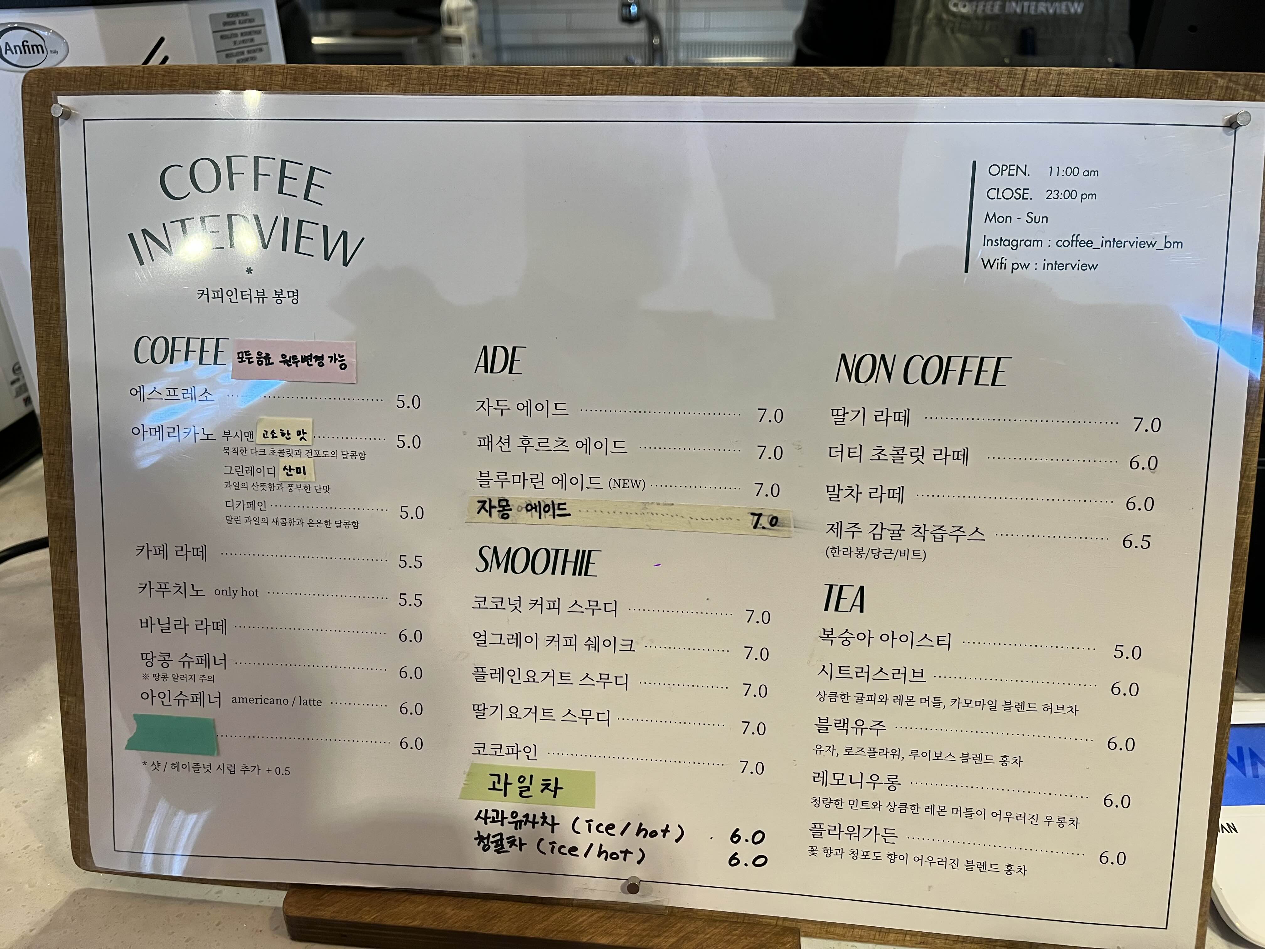 커피인터뷰 메뉴판입니다~ 나는 고소한맛 부시맨 아메리카노를 주문했고 동행인은 자두에이드를 주문했다. 지금 보니까 자두에이드 엄청 비싸네..점심값보다 더 나올 수 있으니 주의하시오.