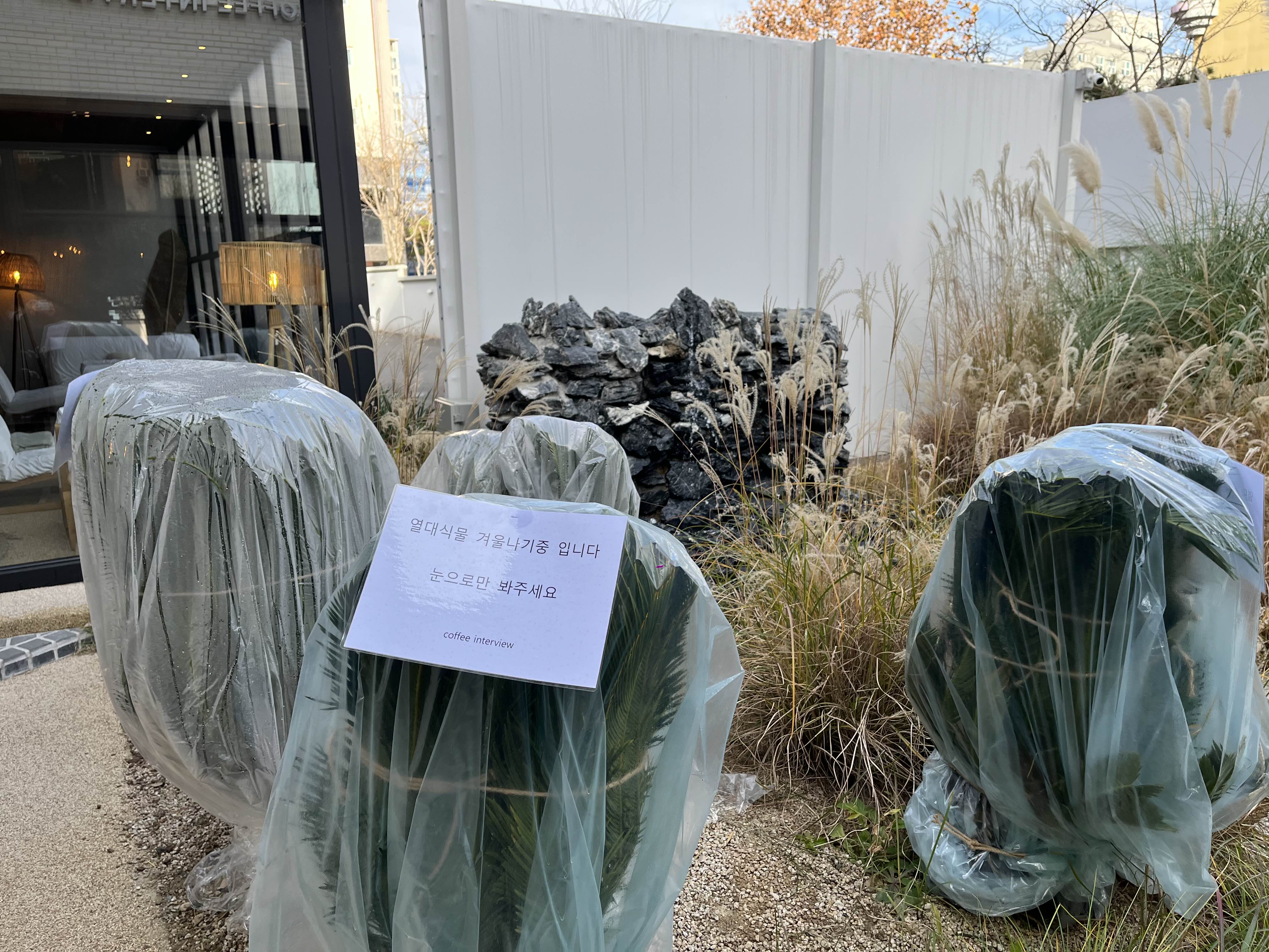 그도 그럴 것이 한국의 겨울은 혹독하니까..마당에 있는 여름 식물들은 겨울을 나기가 힘들 것이다. 열대식물 겨울나기 중이라니 친절한 설명이다. 조화를 배치한 것도 나름 분위기를 살리기 위해 선택한 것일 듯.