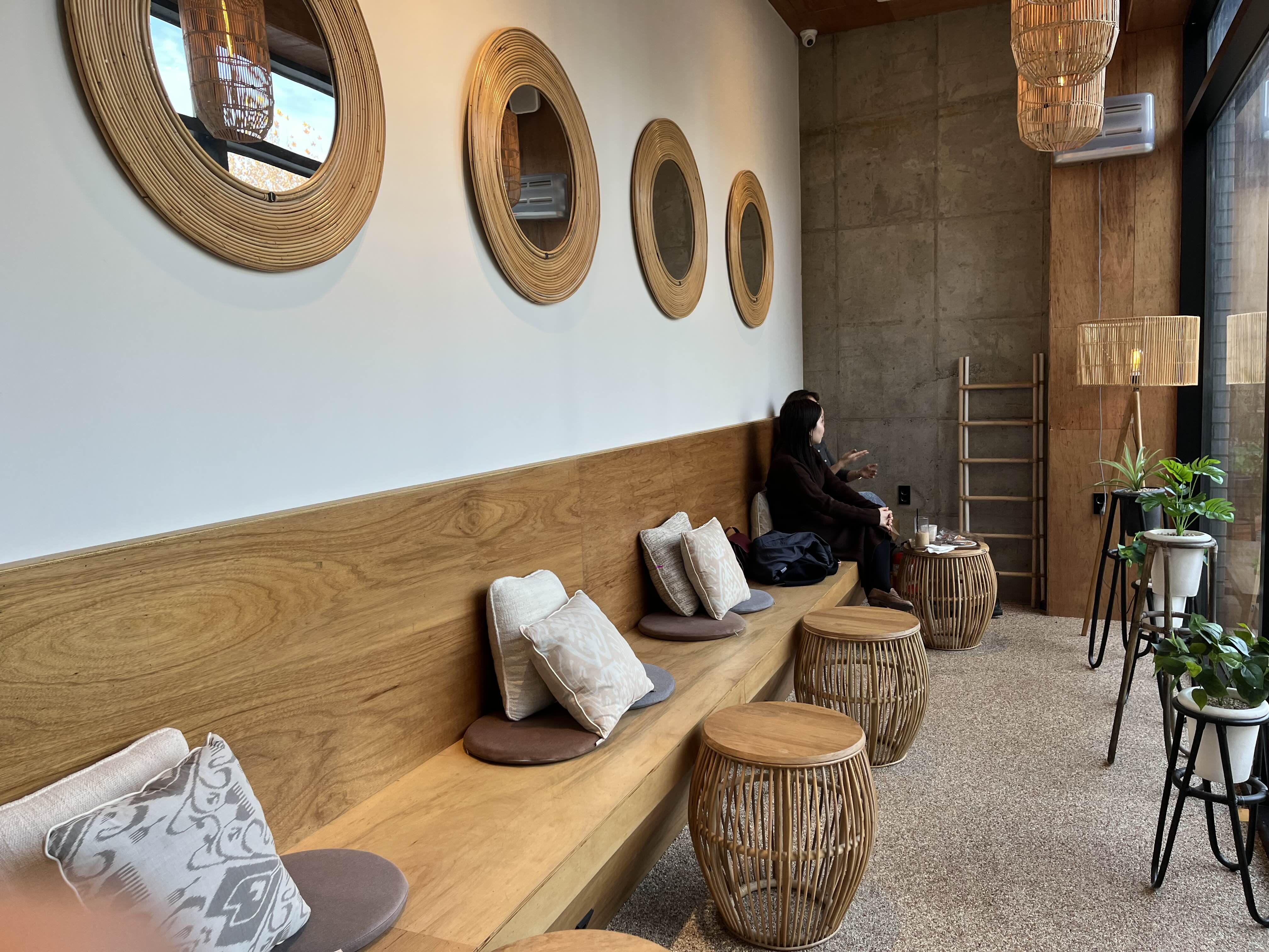 이 자리들은 벽면에 기대 창밖을 보는 구조다. 방금 사진을 찍은 곳과 마주본다고 할 수 있다. 정원이 예쁘게 보이는 자리지만 허리는 꽤 아플 것 같다. 라탄 등과 라탄 테이블 등 라탄 소품이 가득 채워져있다.
