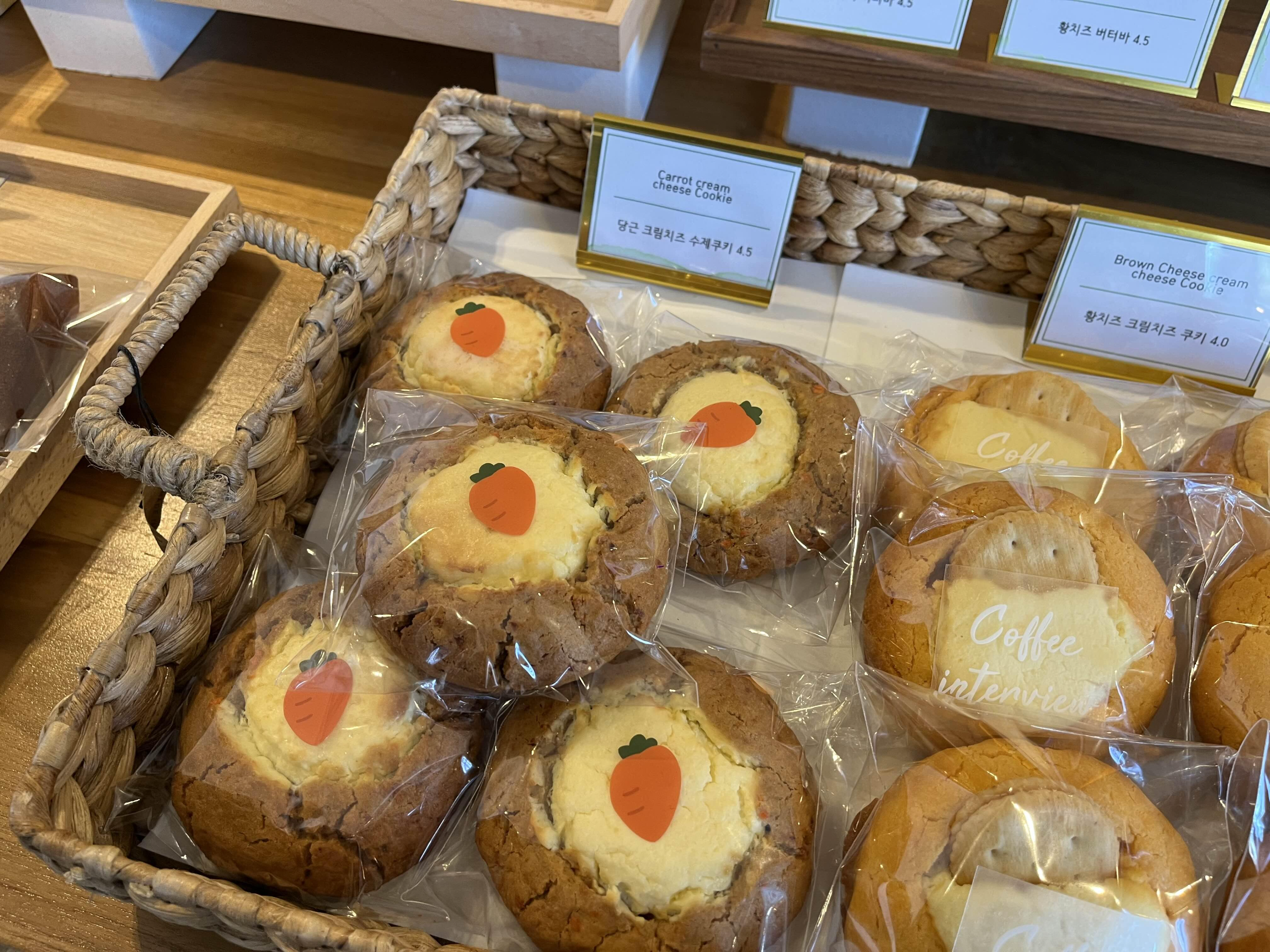 당근 크림치즈 수제쿠키는 4500원이다. 당근 그림이 귀여웠는데 쿠키 위에 찍힌게 아니라 비닐 포장에 그려진 것이다. 깜찍한 아이디어로 눈길을 사로잡았다. 비싸긴 하지만 크기는 커서 궁금한 나머지 초코스모어쿠키를 집어들었다. 카페에서 뭐 안사먹기로 결심했는데...^^;; 돈 많은 사람이 사준대서 ㅎㅅㅎ