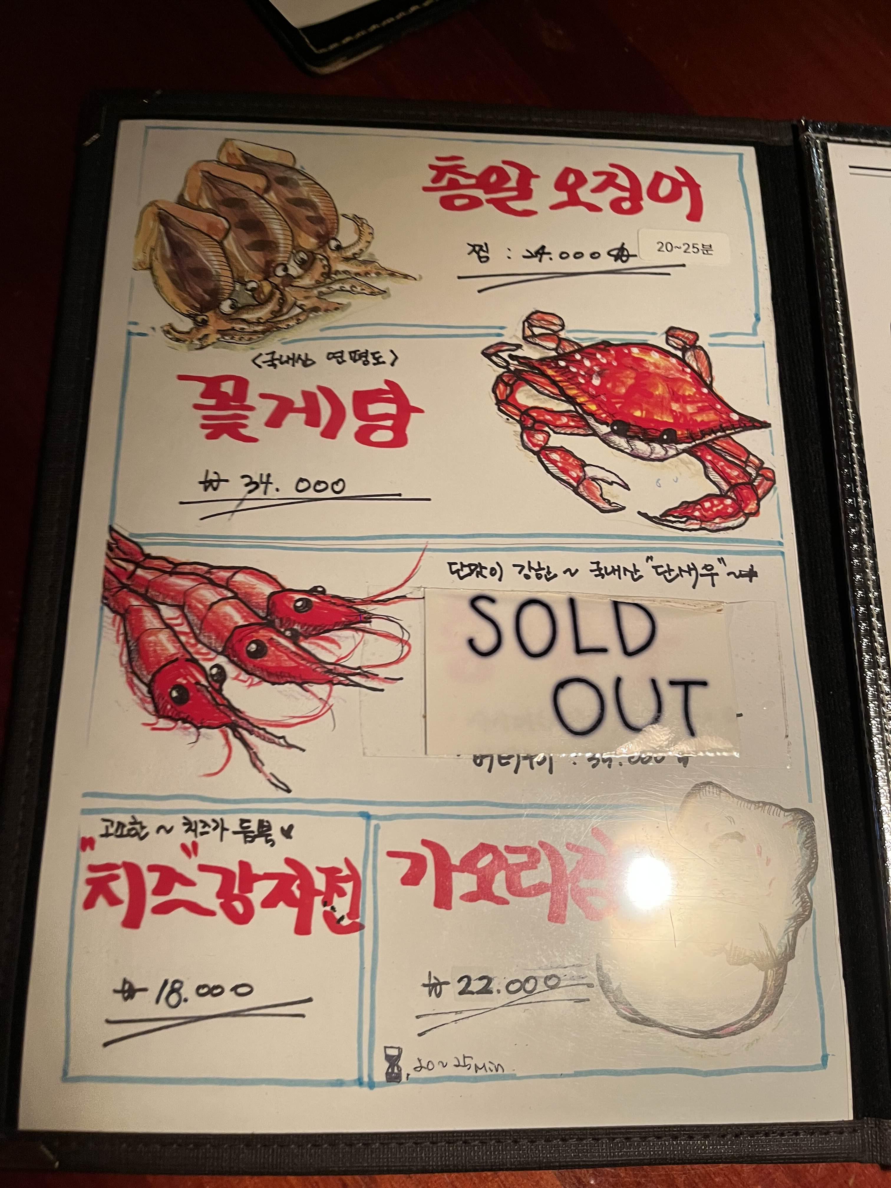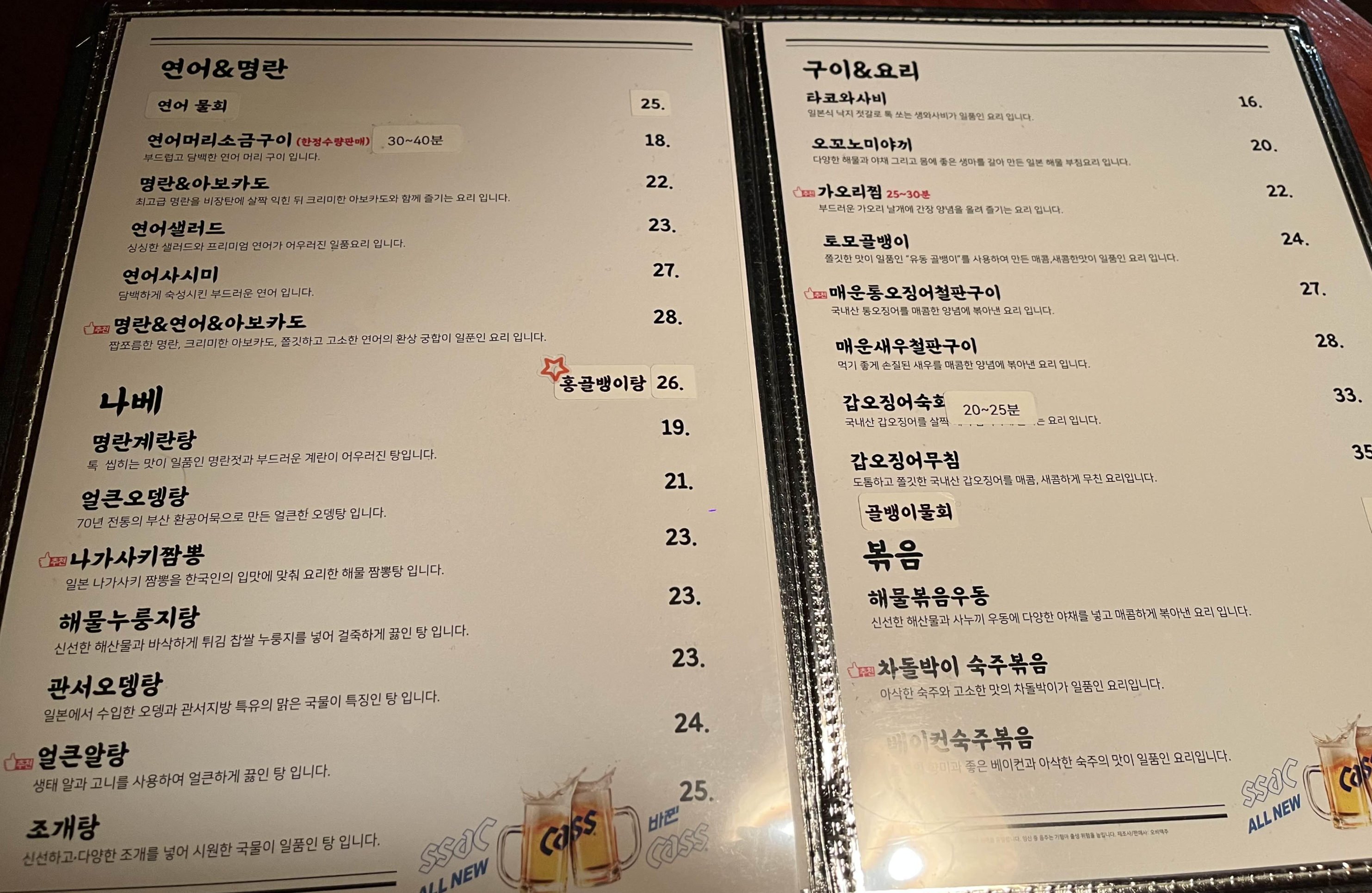 특별 메뉴로 총알오징어와 꽃개탕, 치즈감자전도 판매하고 있었다. 그외 다른 술집에서도 볼 수 있는 국산 주류 메뉴도 많이 있어 취향대로 골라먹을 수 있는 듯 하다.