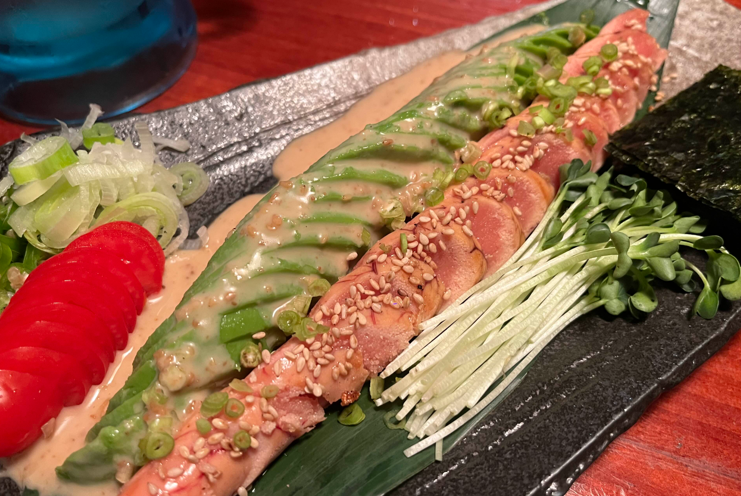 드디어 계양구청 맛집 토모의 아보카도 명란구이가 나왔다. 아보카도와 명란구이를 아주 길고 먹음직스럽게 플레이팅해주셨다. 싱싱한 양파와 김, 토마토까지 빠지는게 없었다.