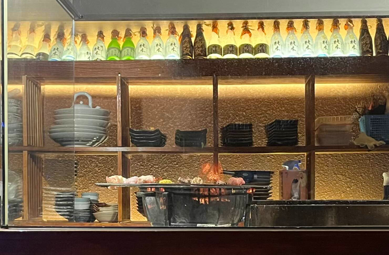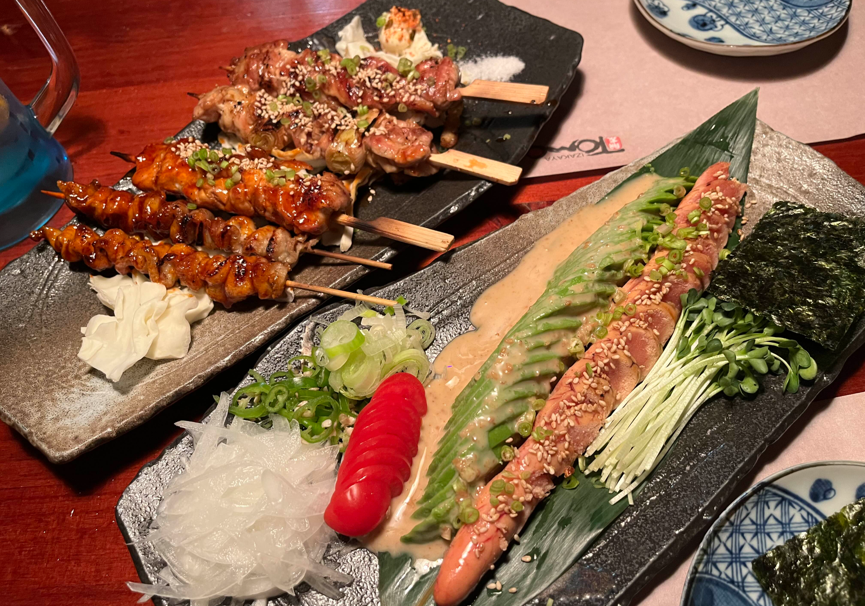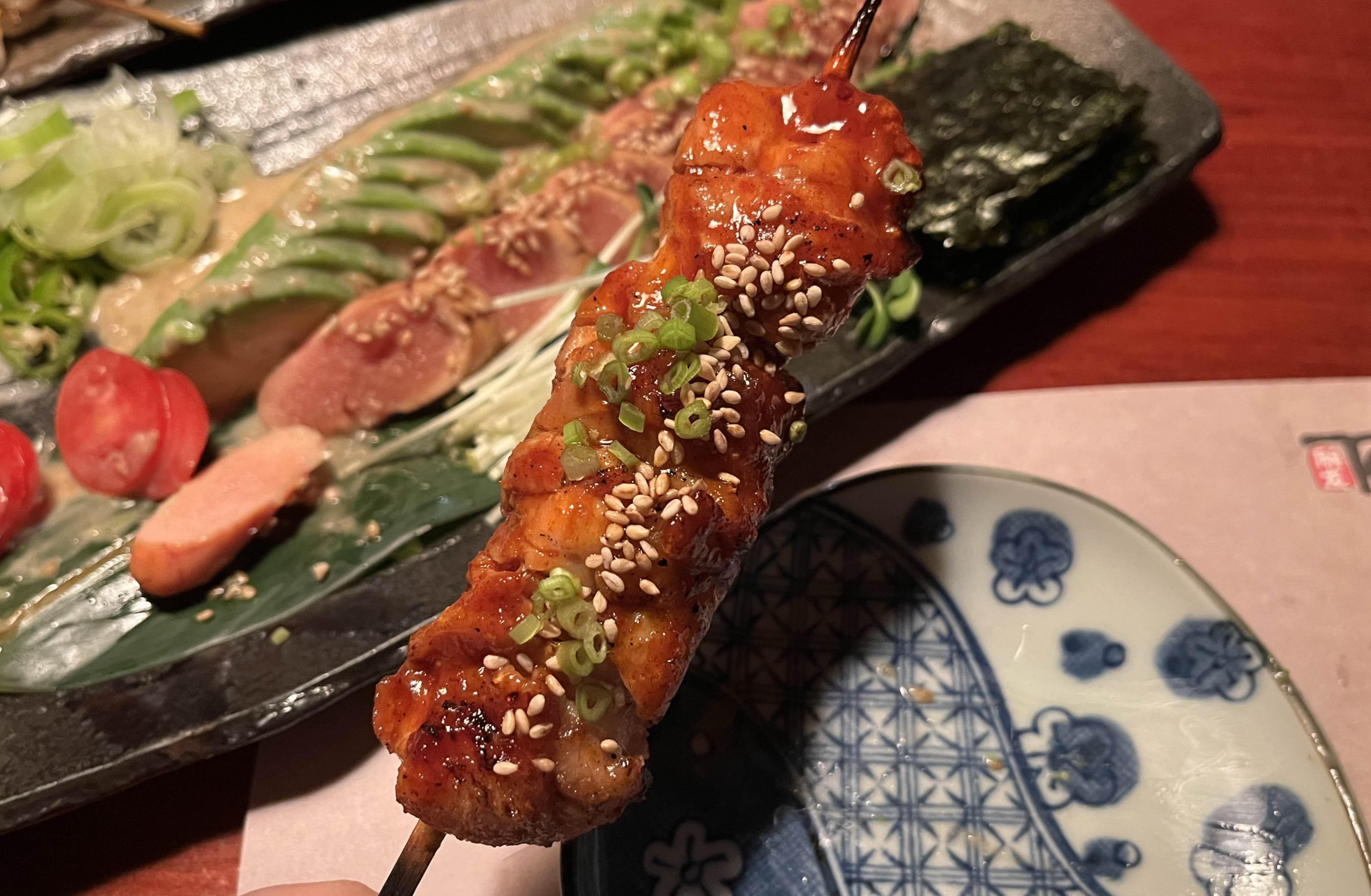 하필 우리가 앉은 자리 맞은편이 꼬치를 굽는 곳이었다. 조리사님이 잠깐 자리를 비운 사이 꼬치들이 맛있게 익어가고 있다.