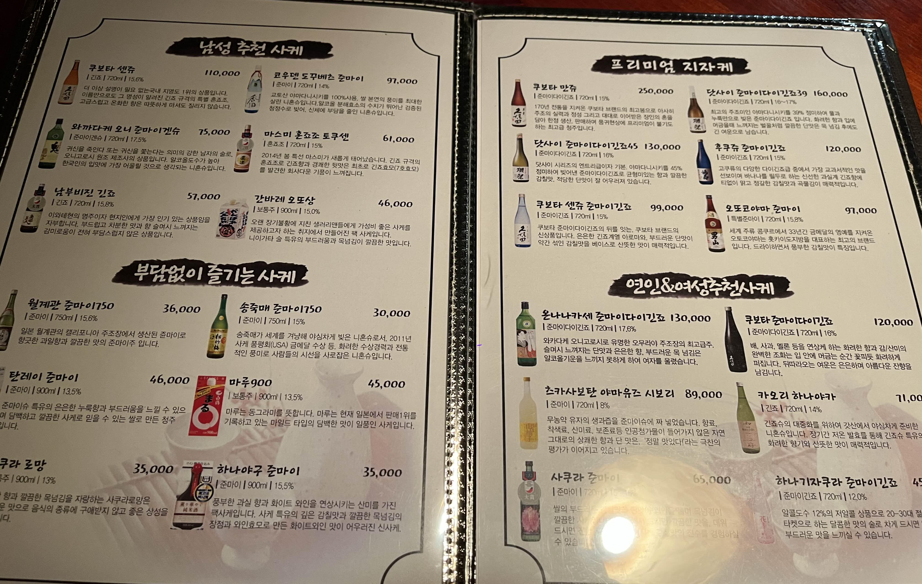 토모에는 이자카야답게 사케류도 많이 준비되어 있다. 남성 여성 추천 사케가 나뉘어있는게 진짜 일본스럽다..