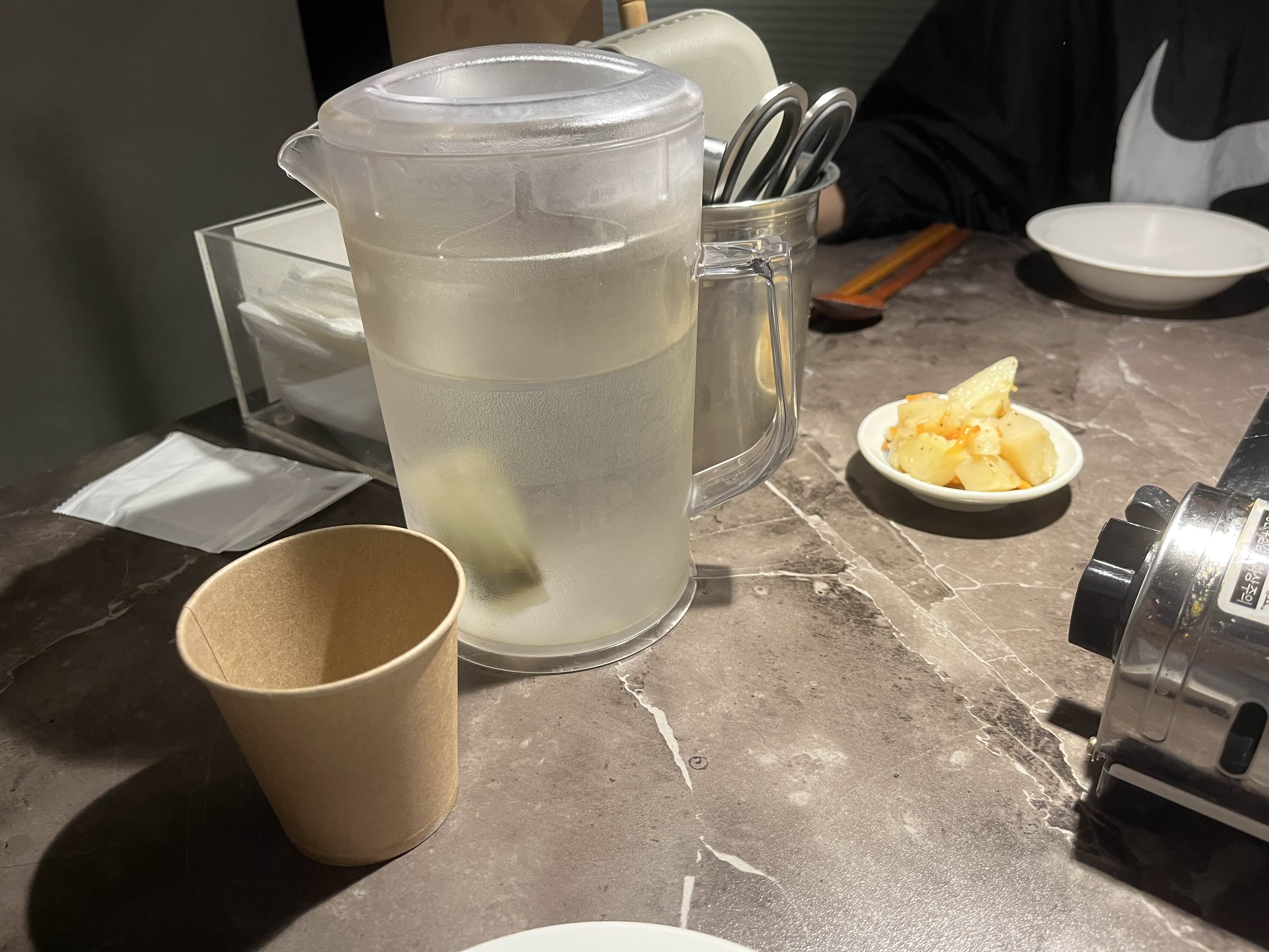 자리에 앉았더니 이렇게 종이컵과 녹차물을 가져다주셨다. 기본안주도 금방 세팅되었다.