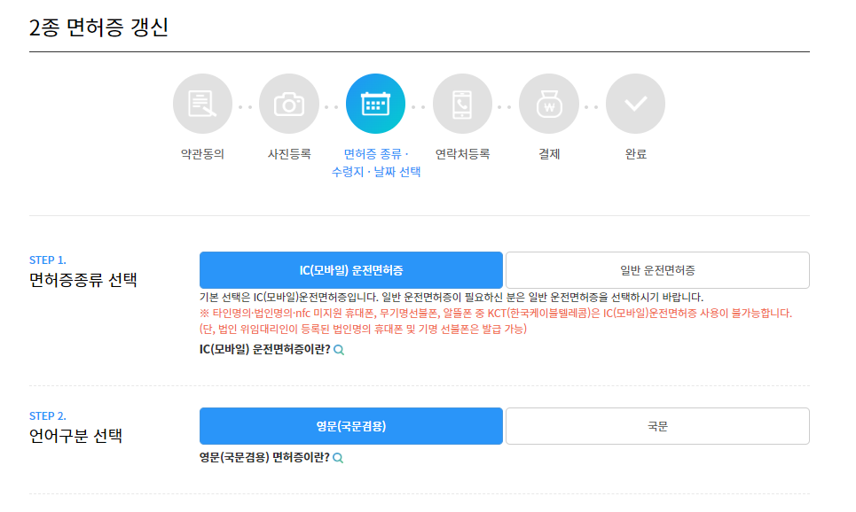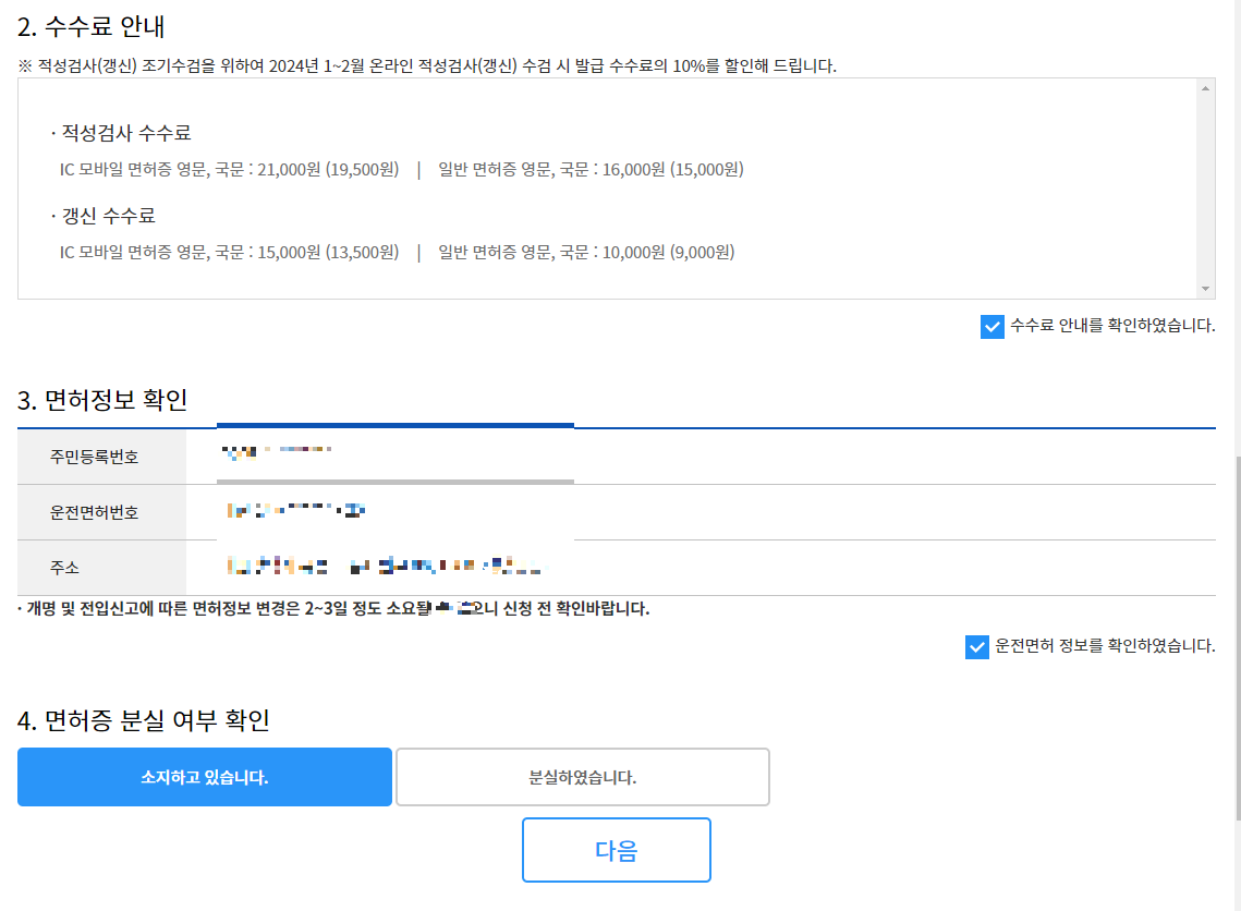 수수료 안내와 면허정보를 확인하고 면허증 분실여부를 체크한 후 다음으로 넘어간다.
