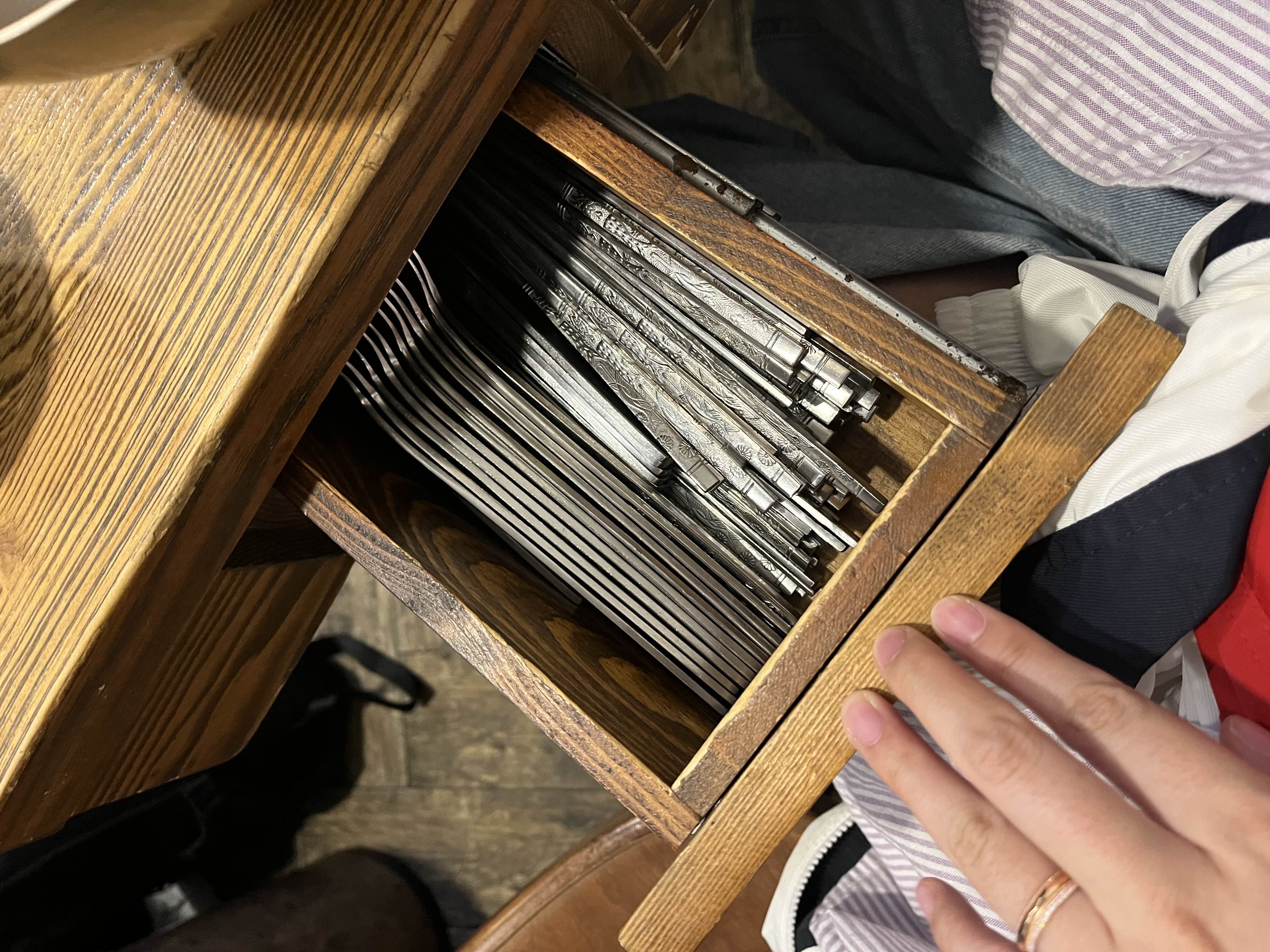 수저는 희한하게 배꼽 앞쪽에 달린 작은 수저통에 들어있다. 서랍식인데 왼쪽에 달려있는 요즘 테이블들과는 좀 다른 양상이다. 수저도 수저통도 오래되어보인다. 그래도 1966년부터 쓰진 않았겠지? (설마)
