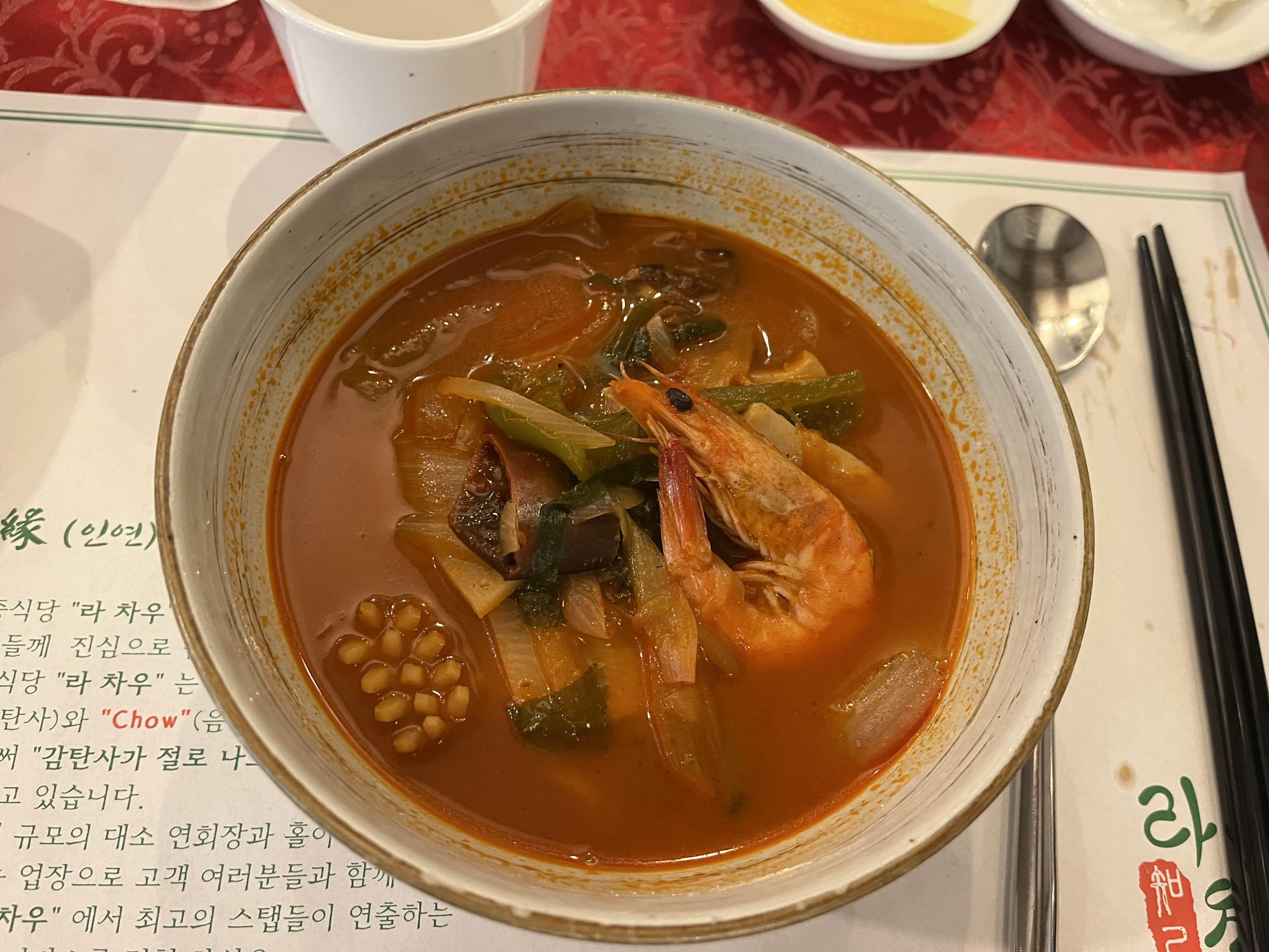 마지막으로 주는 식사요리로 짬뽕을 주문했다. 그릇은 작은데 오징어 새우 등 갖가지 재료가 풍성하게 들어가있다. 면도 적지 않다. 이쯤 되면 배가 너무 부르다고 생각한다. 다음부터는 메뉴가 적게 나오는 코스를 먹어야지 싶다.