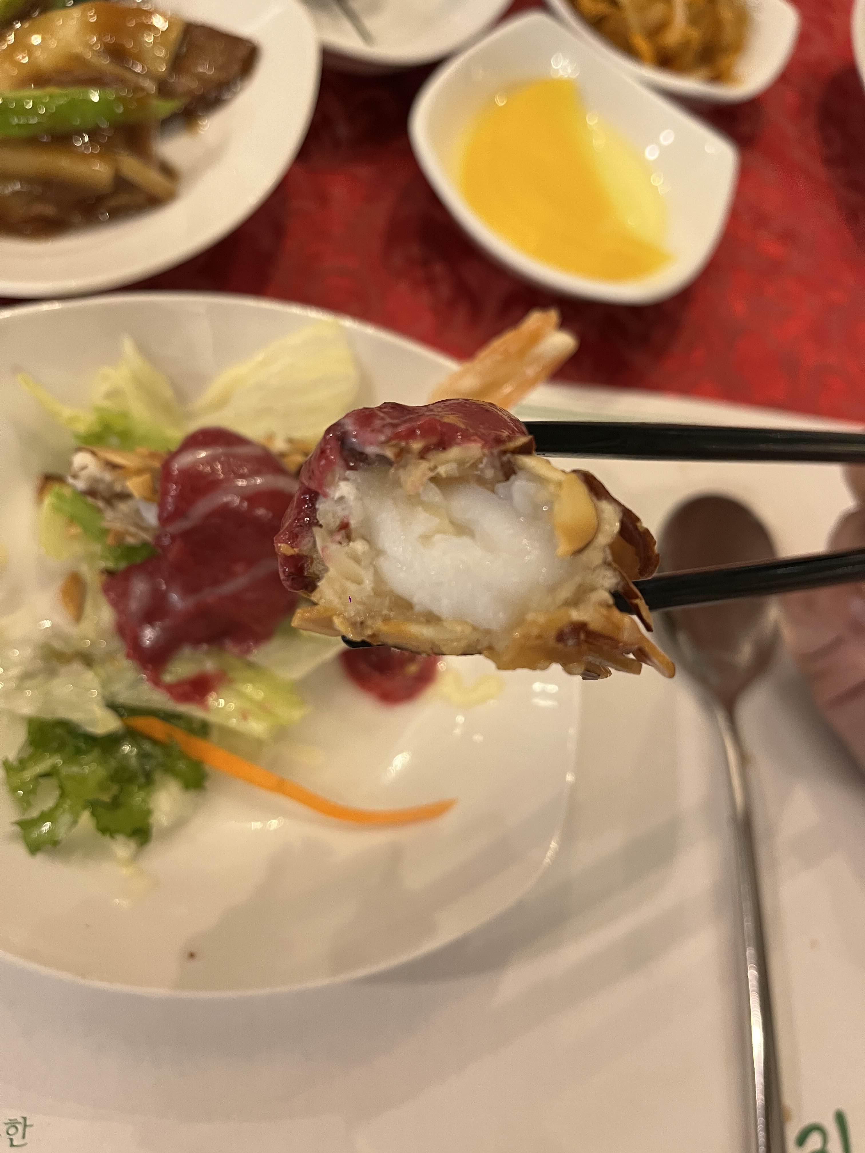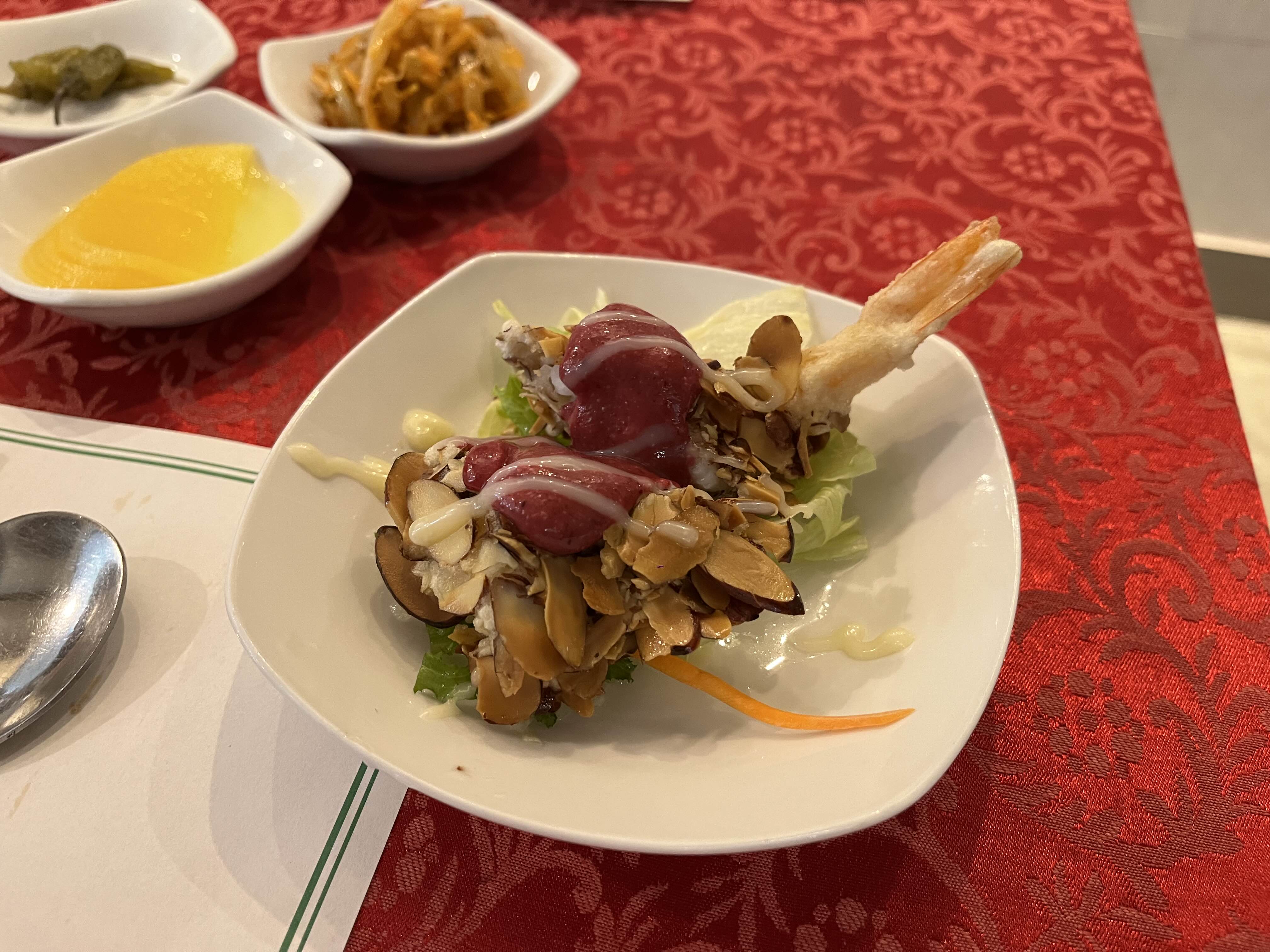 다음은 아몬드 등의 견과류를 둘러 튀긴 중새우 요리이다. 이전에 왔을 때도 중새우 요리로 같은 요리가 나왔는지는 모르겠으나, 견과류는 아삭하고 소스는 달짝지근해서 무척 새로운 맛이다. 아득아득 씹는 것이 재밌다. 대전 중식 코스 요리