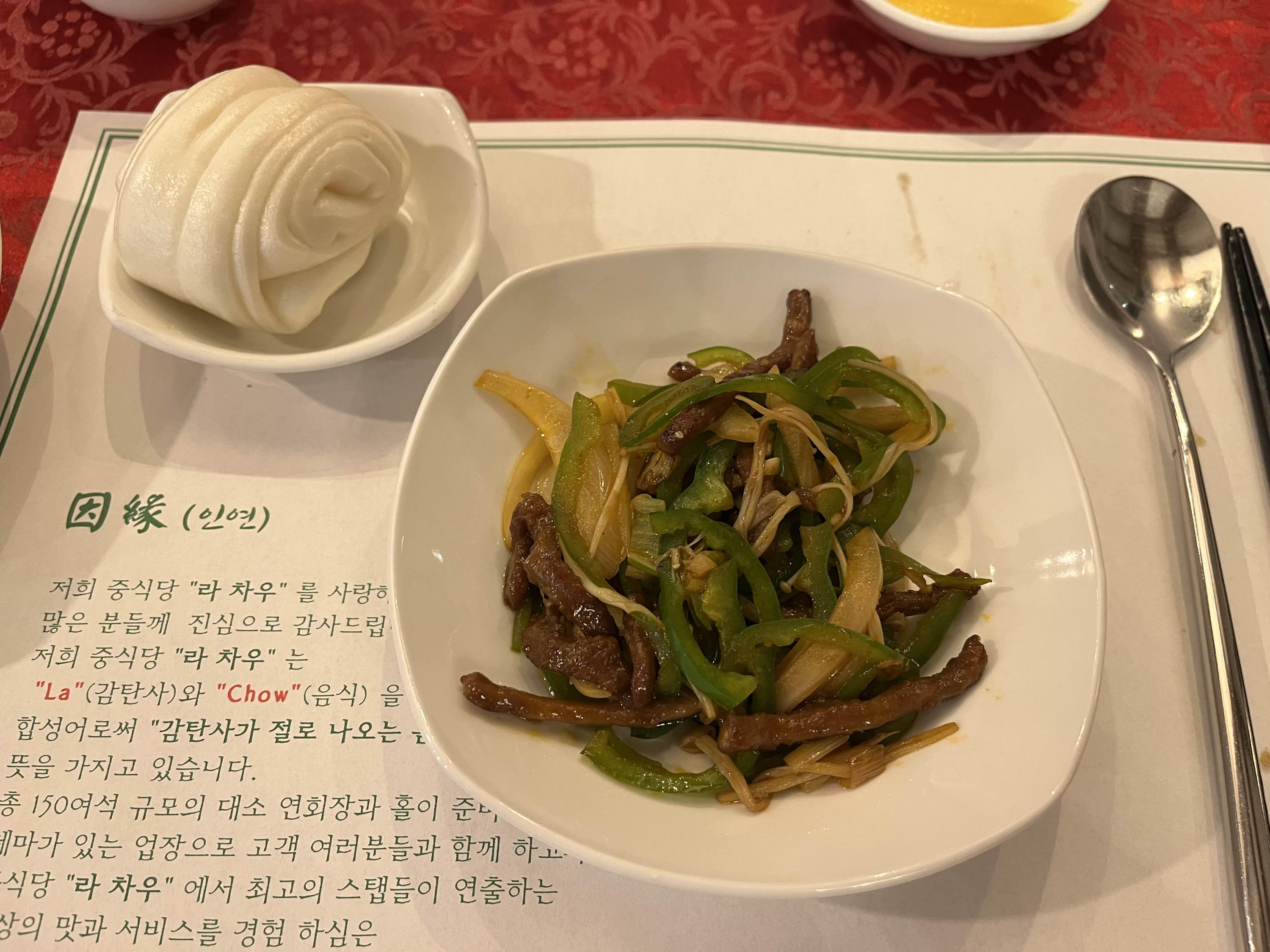 다음 요리는 이 식당에서 내가 가장 좋아하는 메뉴다. 불향과 간간한 소스가 얇게 썬 피망, 양파, 소고기와 안성맞춤으로 어우러진다. 꽃빵은 그리 좋아하지 않지만 간이 된 야채볶음을 맛있게 먹기 위해 싸먹는 용도로 활용한다. 고추잡채라고 볼 수 있는데, 다음번에 와서는 고추잡채만 주문해 먹어야하나 싶다.