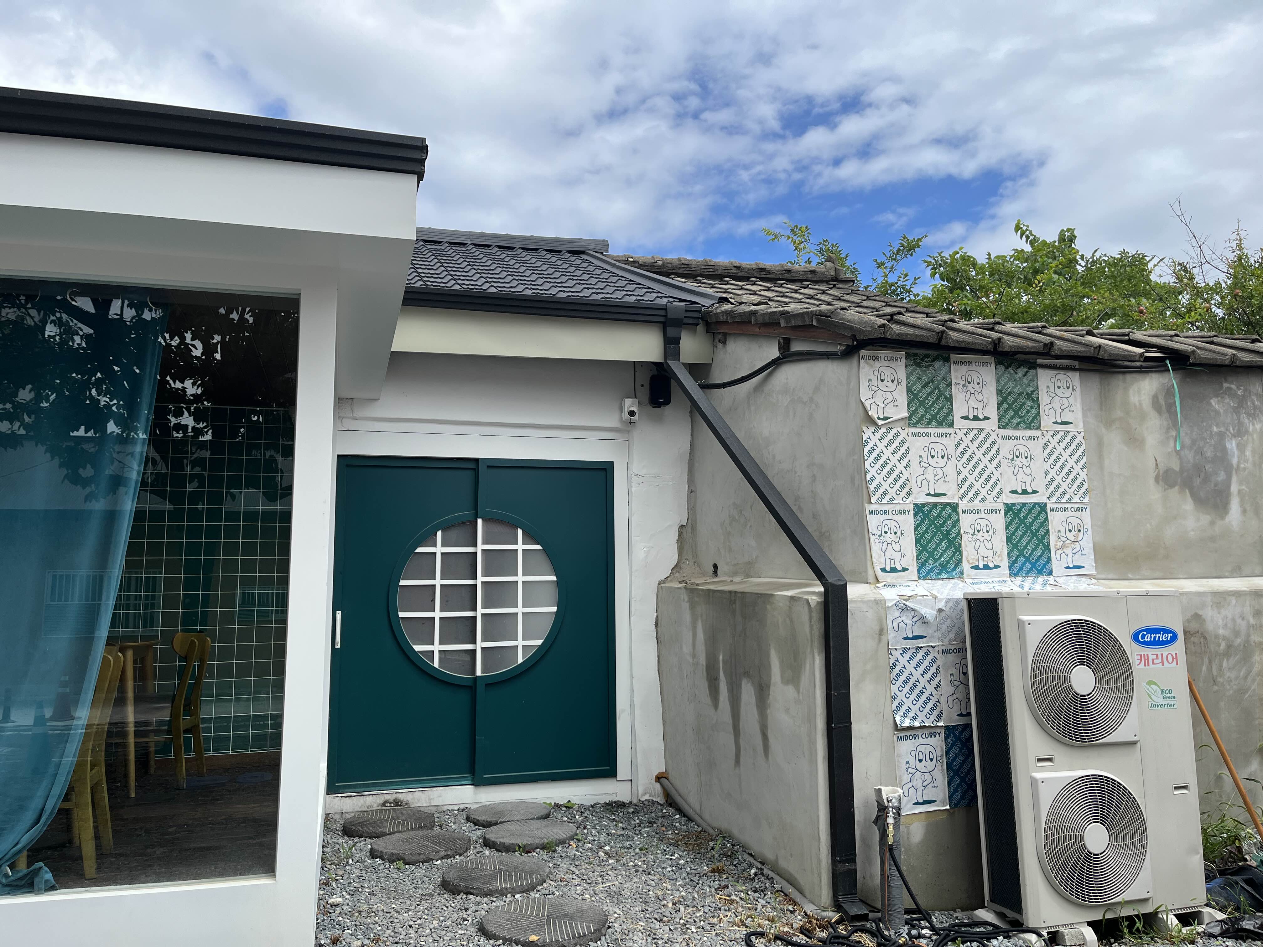 구옥이 조금 좁았는지 바깥쪽으로 통유리로 공간을 넓힌 모습이 보인다. 아마 저곳에서 식사하는 사람들을 배려하기 위해 짙은 색의 커튼이 쳐져있는 것 같다. 주차공간이 있어서 차를 여러대 댈 수 있는 것 같았다.