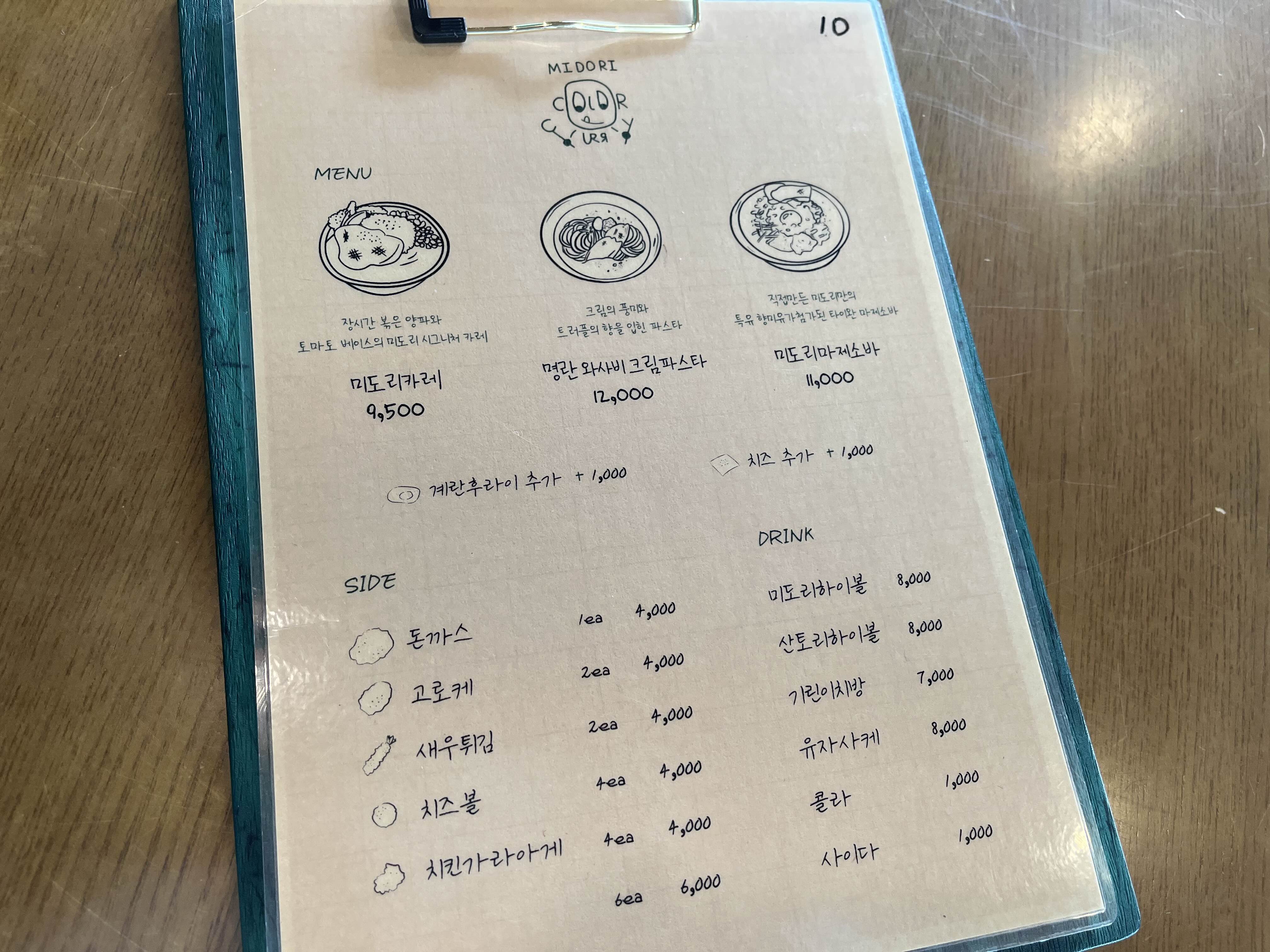 미도리카레의 메뉴판이다. 메인 메뉴로는 미도리카레, 파스타, 소바 세가지가 있고 사이드로 튀김류를 주문할 수 있다. 나와 동행인은 기본 카레 두개와 새우튀김을 주문했다.
