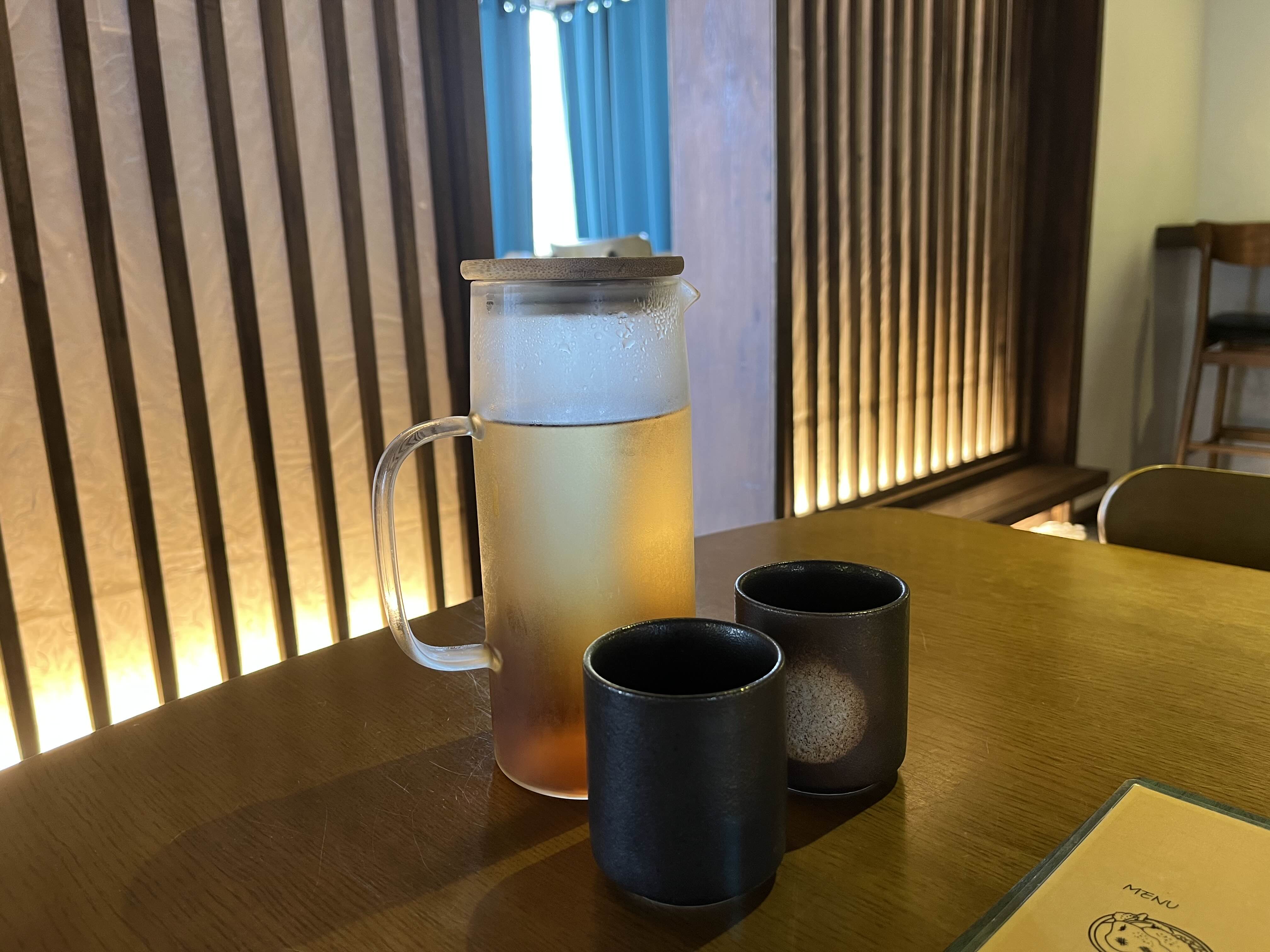 아주 더운 여름날이었는데 센스있게 차가운 물을 준비해주셨다. 잔의 무늬와 질감이 특이해 눈여겨볼만 했다.