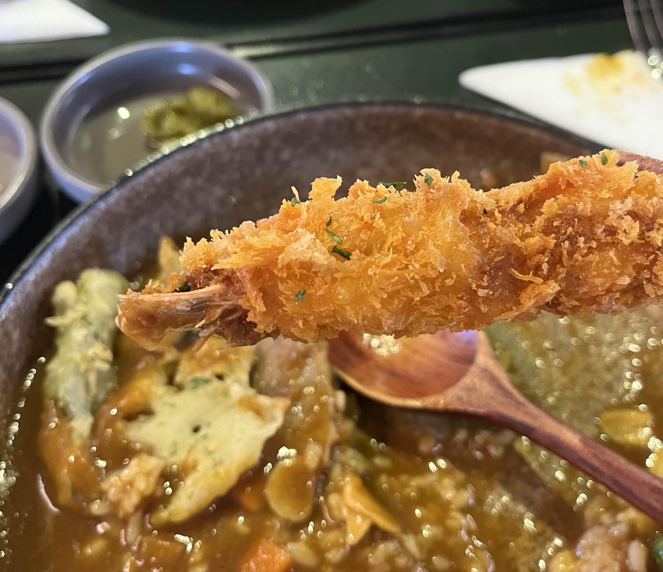 나는 새우튀김을 카레에 찍어먹는 것을 좋아하기 때문에 미도리카레에서도 왕새우튀김을 카레에 찍어먹었다. 한층 부드러워져 더 맛이 좋았다.