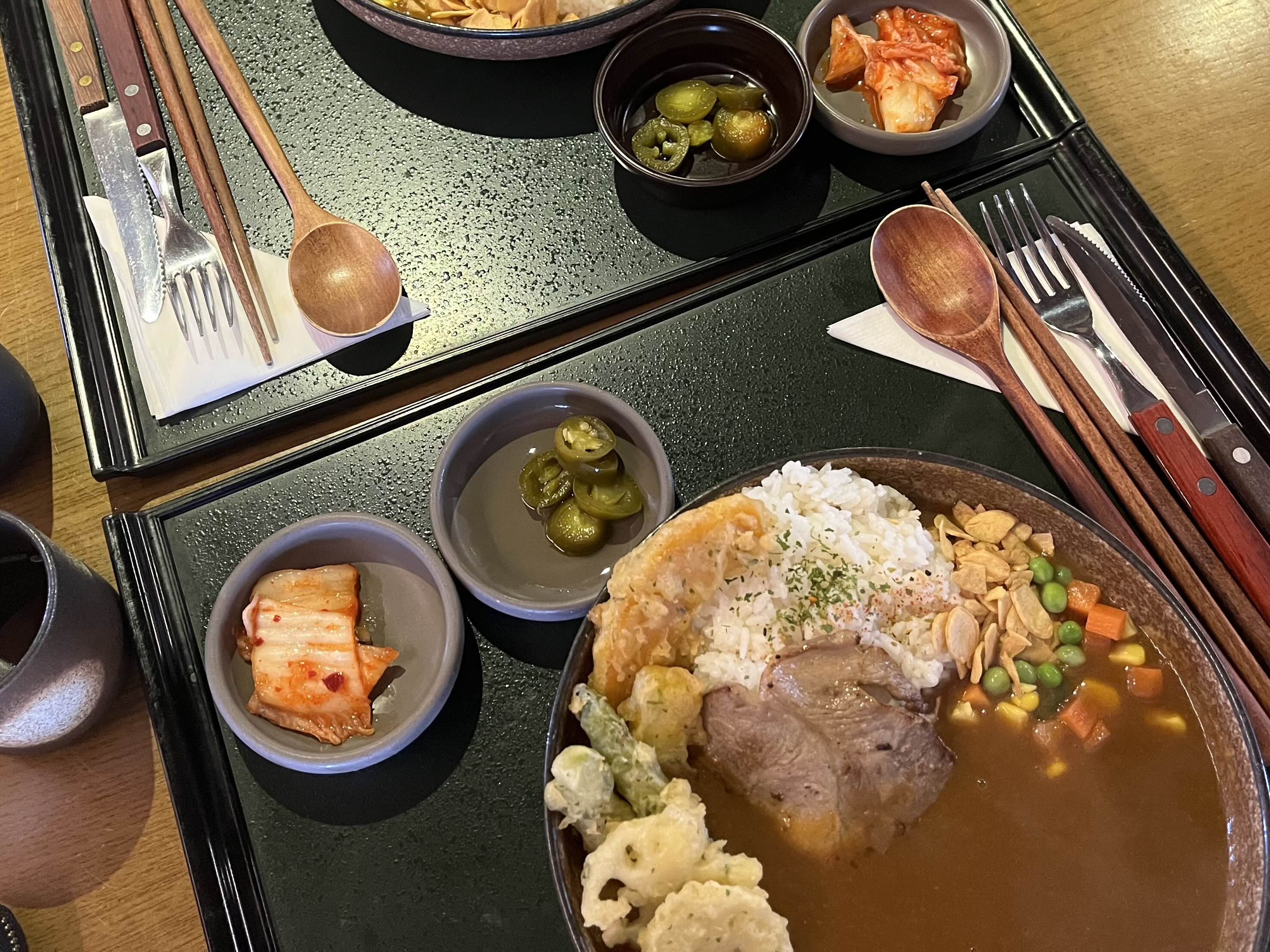 반찬으로는 김치와 할라피뇨가 제공되었다. 나무숟가락과 젓가락, 포크와 나이프까지 한꺼번에 주셨다. 아마 고기를 썰어먹을 때 사용하라는 것 같다.