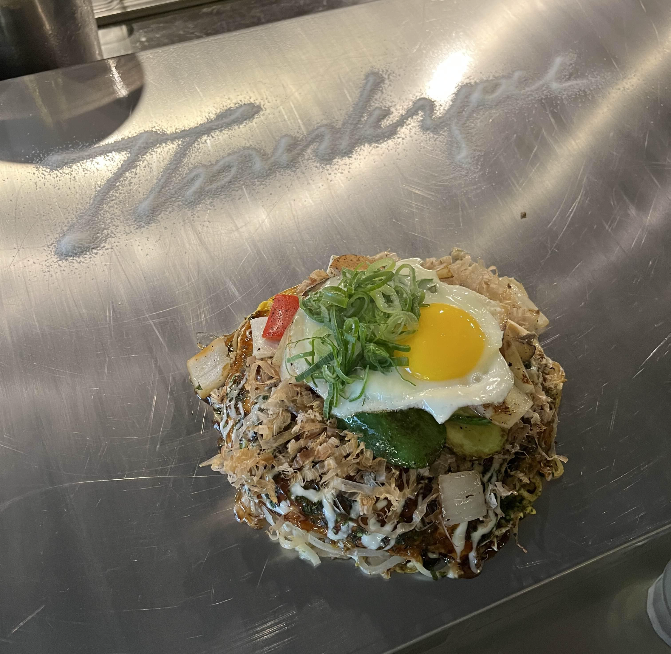 직원분이 설탕? 으로 글자를 써주시는 이벤트도 있었다. 신기해서 영상도 찍음ㅎㅎ 오코노미야끼는 헤라라는 도구로 썰어 앞접시에 덜어 먹었다.