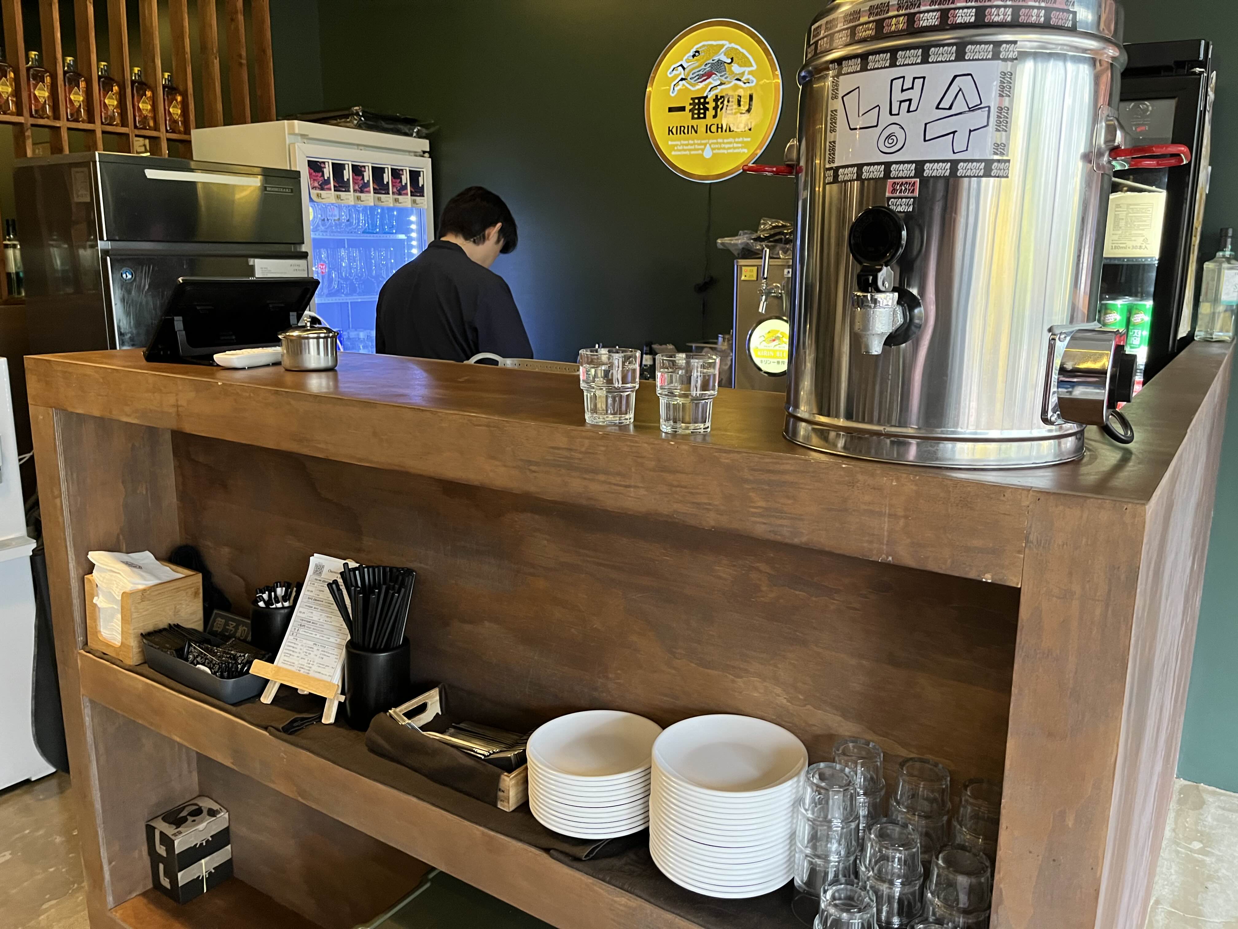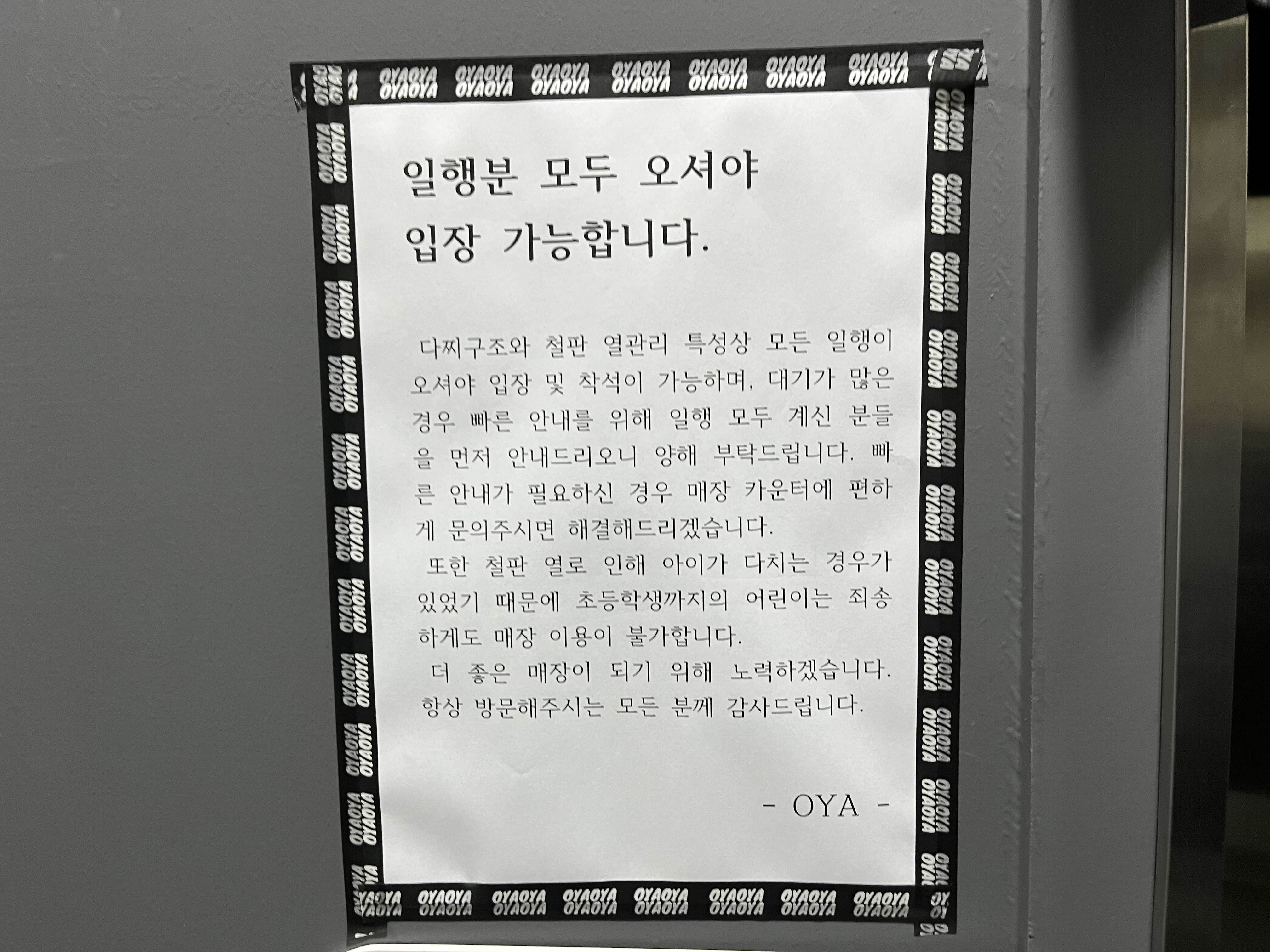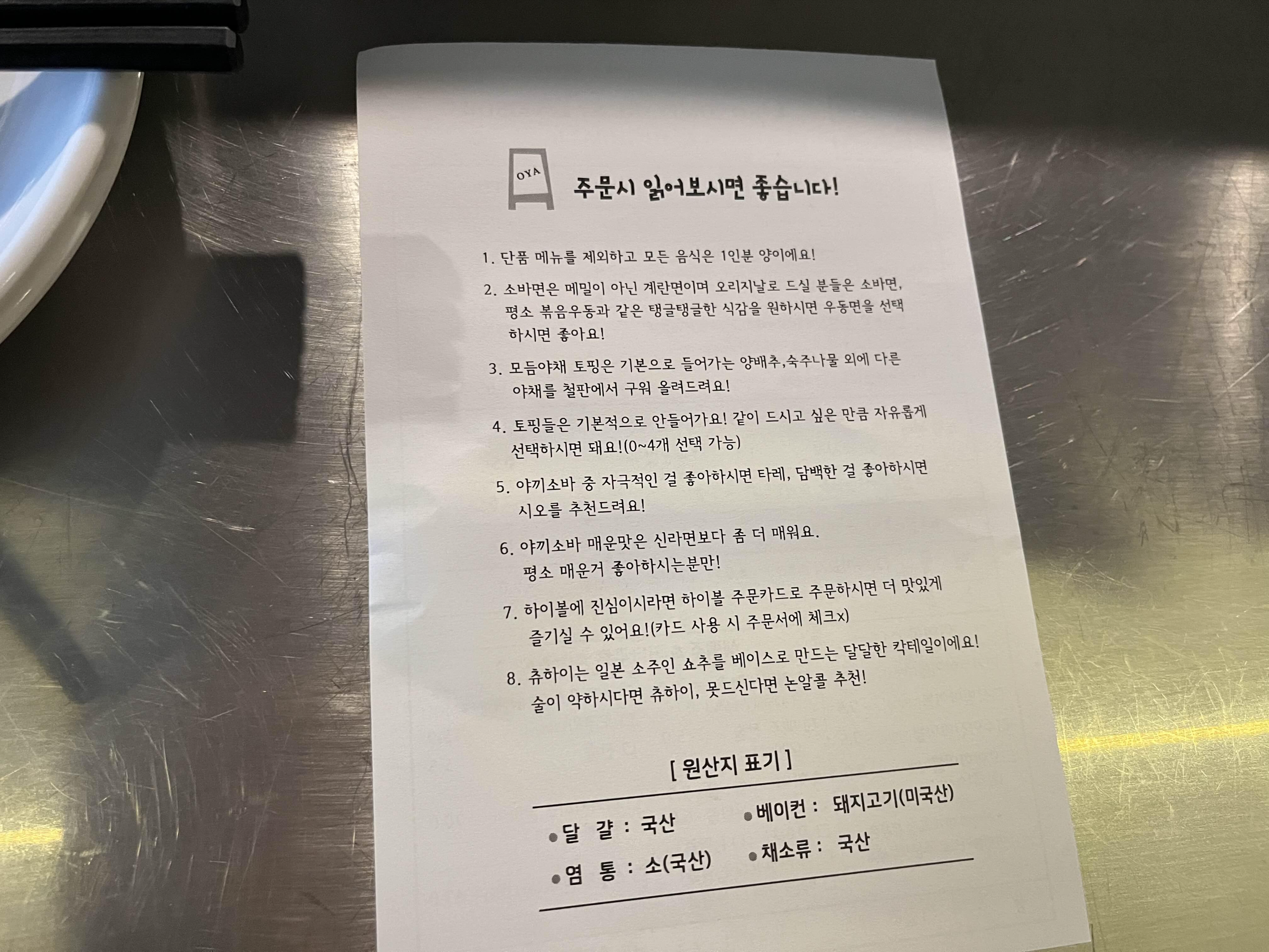 물은 셀프로 가져와도 되고 달라고 하면 직원이 가져다주기도 한다. 냅킨과 추가 그릇 등을 셀프바에서 가져올 수 있다. 오야에는 일본 시티팝이 흘러나왔는데 플레이리스트가 꽤 좋았다.
