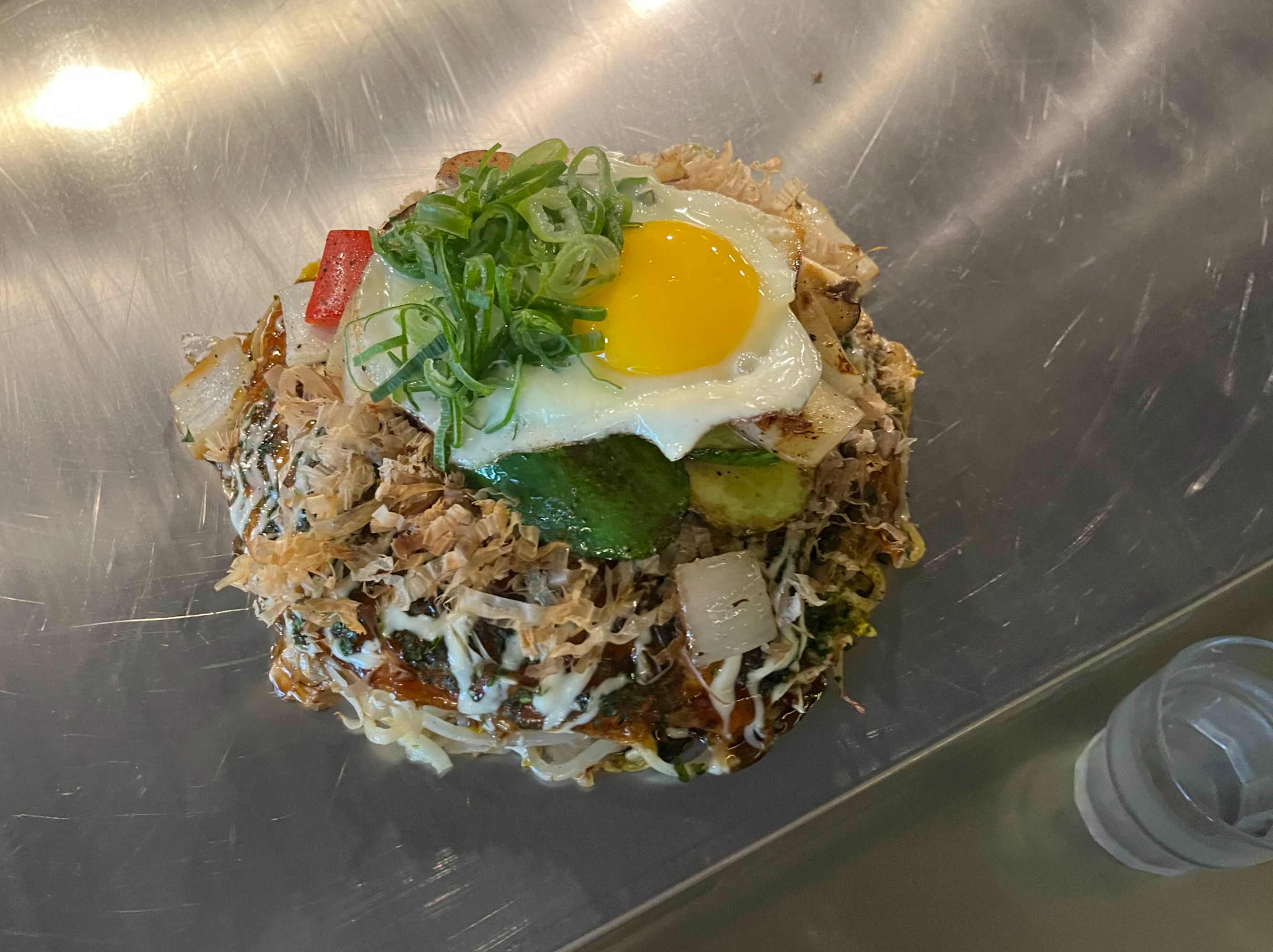 오코노미야끼는 재료를 층층이 쌓아 구운 후 우리가 추가한 양파, 애호박, 피망 등의 모듬 야채가 더해져 잘 익은 상태로 서빙 되었다.