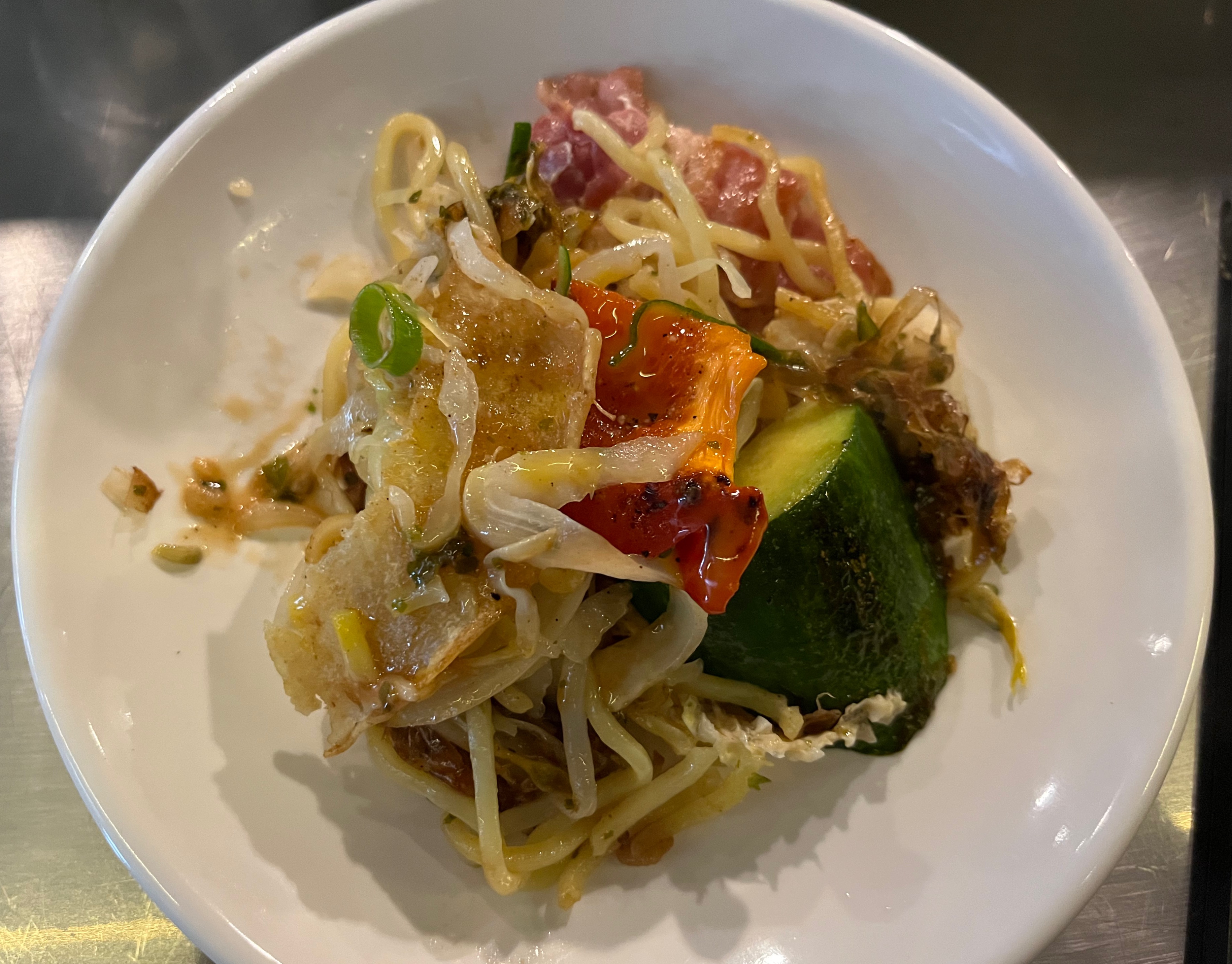 먼저 야끼소바부터 나왔다. 야끼소바 만들어주신 직원이 요건 내려놓고 먹는게 편하다고 해서 철판에서 내려놓았다.