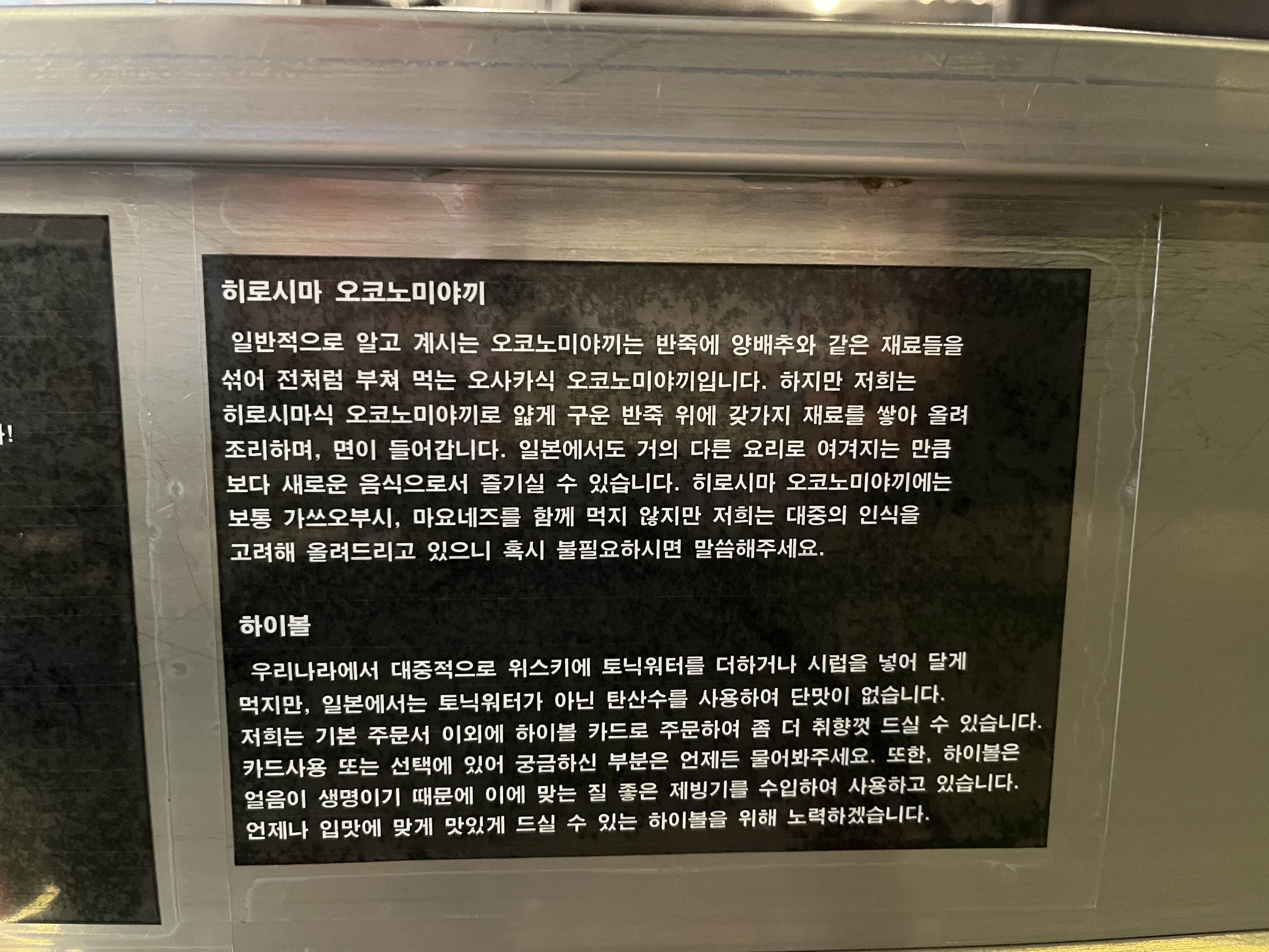 조금 기름지다 싶을 때쯤 제로콜라 하나 주문해서 먹었더니 정말 딱 맞았다. 음식도 괜찮았지만 매장이 깨끗해서 믿음이 갔고 플리가 좋아서 분위기도 좋았다. 너무 붐비지도 않고 철판 오코노미야끼 만드는 모습을 보고 맛볼 수 있는 곳이라 다음에는 저녁에 방문해서 맥주한 잔 하고 싶다는 생각을 했다. 재방문의사 있음!
