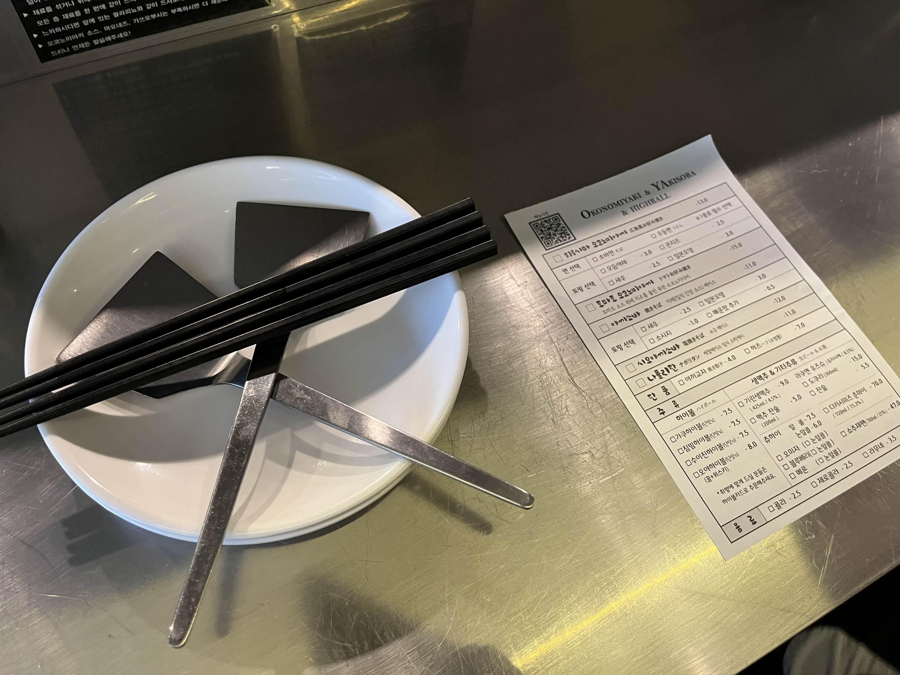 자리에 앉으니 2인분의 젓가락과 앞접시, 메뉴를 주문할 수 있는 종이가 놓여있었다.