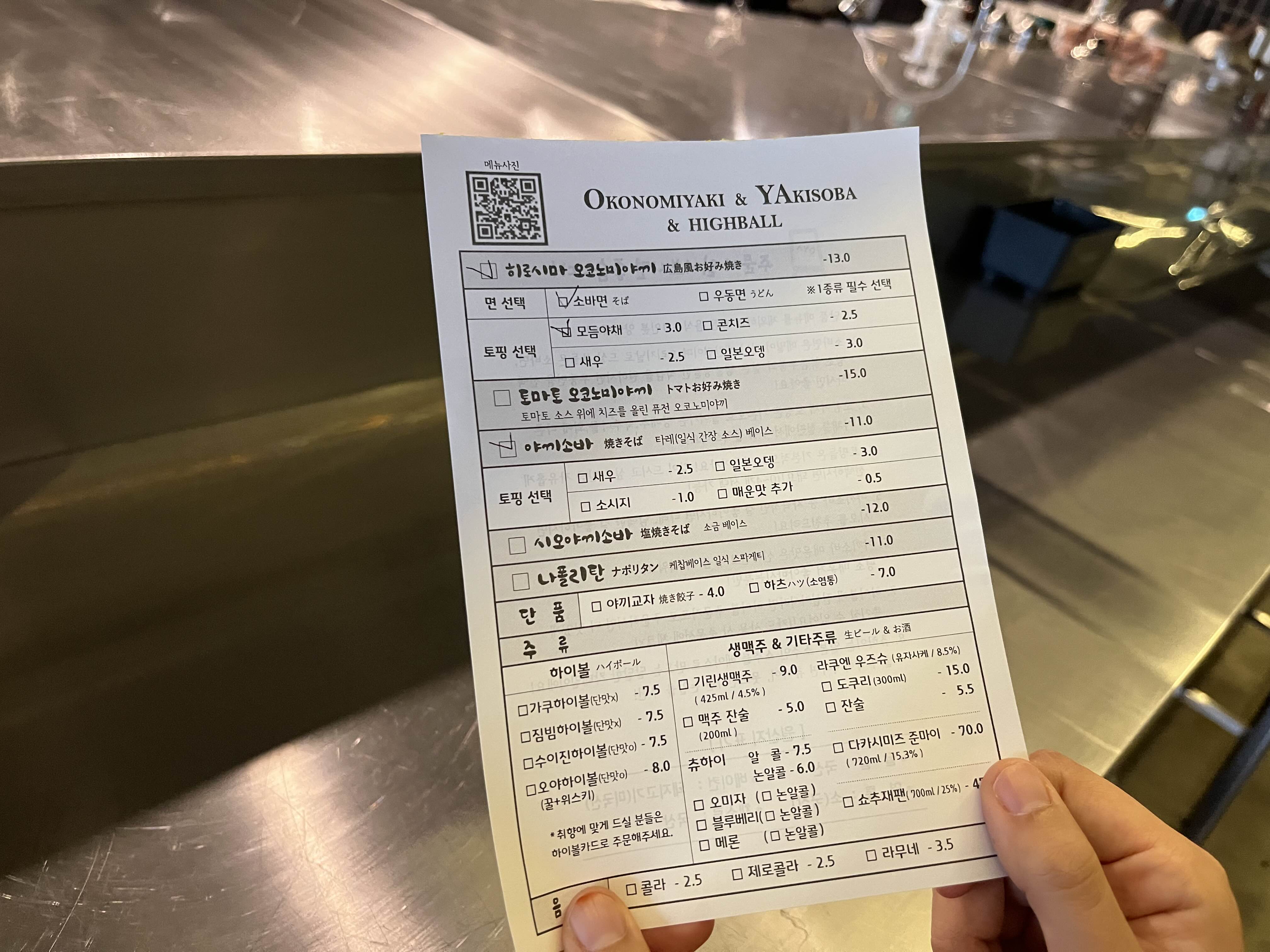 우리는 처음 오야에 방문했기 때문에 주문하는 방법을 천천히 읽어보고 메뉴를 정했다. 오코노미야끼에 모듬야채를 추가하고 야끼소바 하나를 주문함~ 맛있겠다